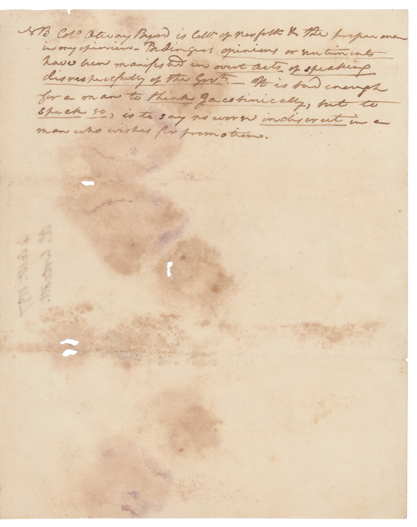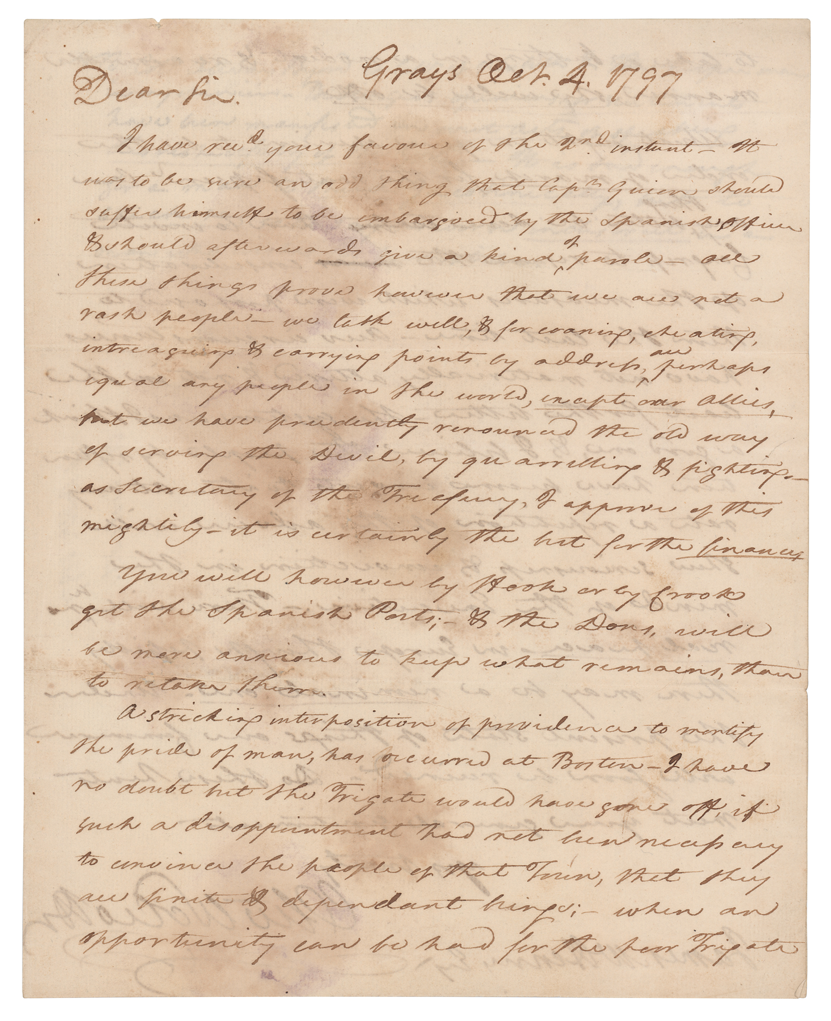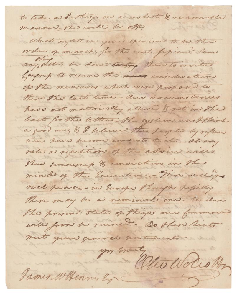 ALS signed “Oliv. Wolcott,” one page both sides, 8 x 10, October 4, 1797. Handwritten letter to James W. Henry, in part: "I have rec'd your favour of the 2nd instant—it was to be sure an odd thing that Cap'n Grier should suffer himself to be embargoed by the Spanish officer & should afterwards give a kind of parole—all these things prove however that we are not a rash people…we have prudently renounced the old way of serving the Devil by quarrelling & fighting—as Secretary of the Treasury, I approve of this mightily—it is certainly the best for the finances. You will however by Hook or by Crook get the Spanish Ports…A striking interposition of providence to mortify the pride of man has occurred at Boston. I have no doubt but the Frigate would have gone off if such a disappointment had not been necessary to convince the people of that Town, that they are finite & dependent beings." In very good to fine condition, with scattered staining, and small areas of paper loss.