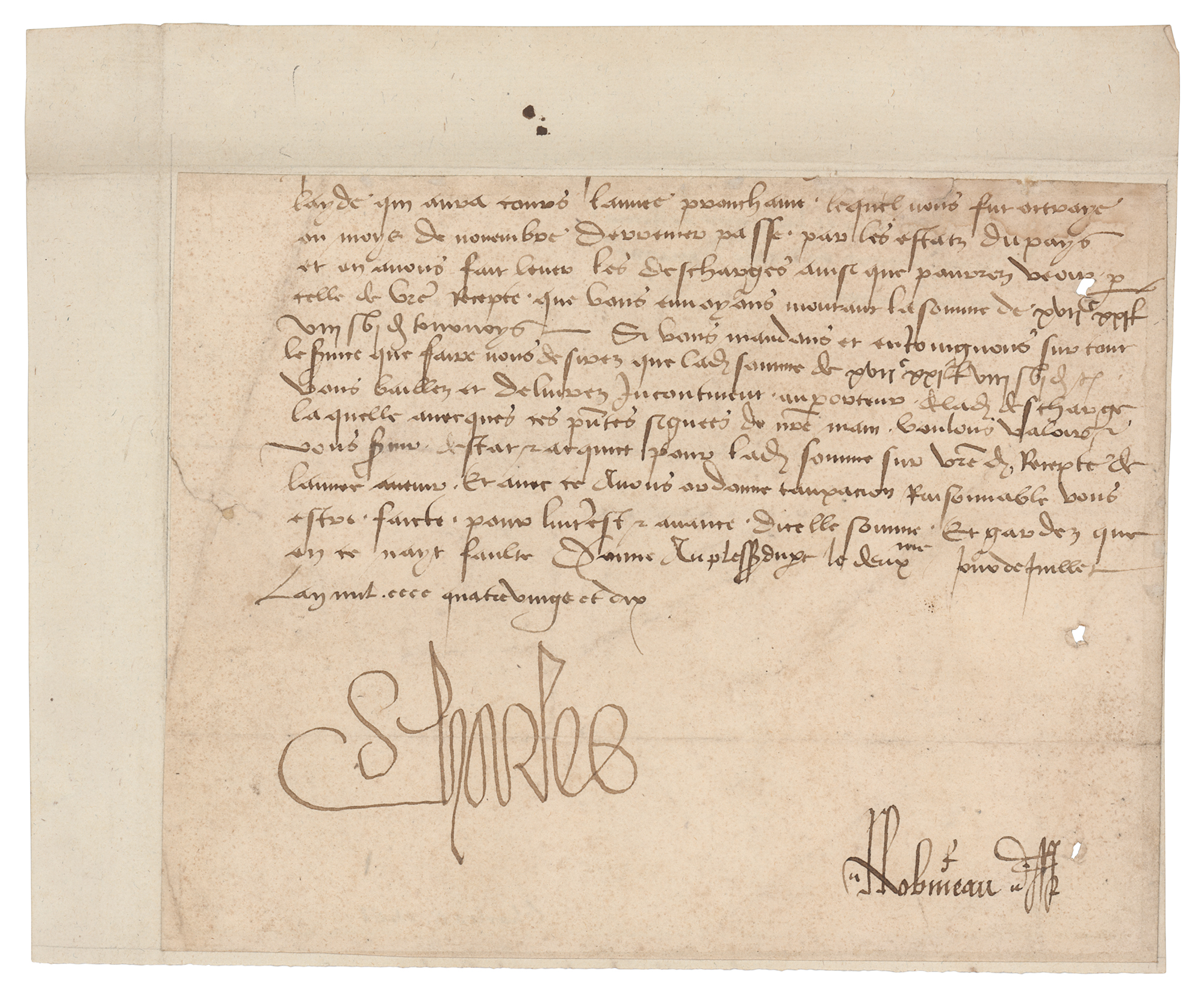 Monarch of the House of Valois (1470-1498) who ruled as King of France from 1483 to his death in 1498. Rare partial untranslated manuscript DS in French, signed “Charles,” one page, 7.5 x 6, 1481. Professionally inlaid into a slightly larger sheet. In very good to fine condition, with a repaired tear to the left edge, three small holes near the right edge, and the top section excised and no longer present.