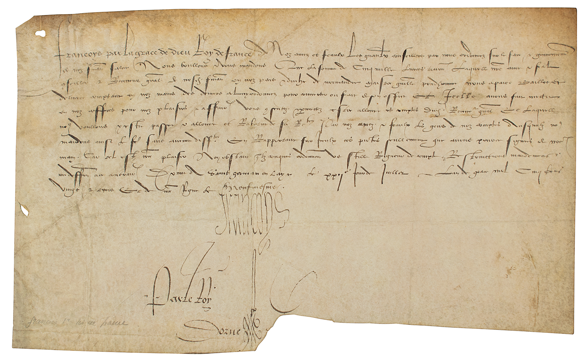 King of France (born 1494) who reigned from 1515 until his death in 1547. Known as the 'Father and Restorer of Letters,' the cultured and well-read Francis, himself a poet, ushered in the Renaissance in France with generous support for a number of writers and ambitious construction projects. Vellum manuscript DS in French, signed “Francoys,” one page, 13 x 8, no date. Untranslated. In very good condition, with overall soiling and toning, two small holes to the left edge, trimming to the bottom edge, and some skipping to the signature.