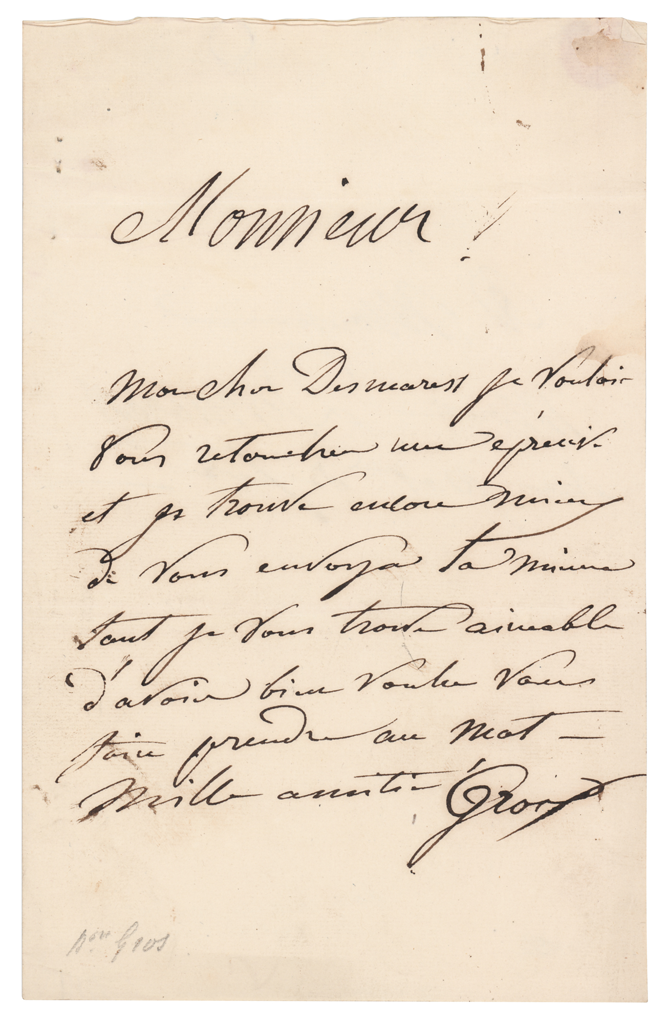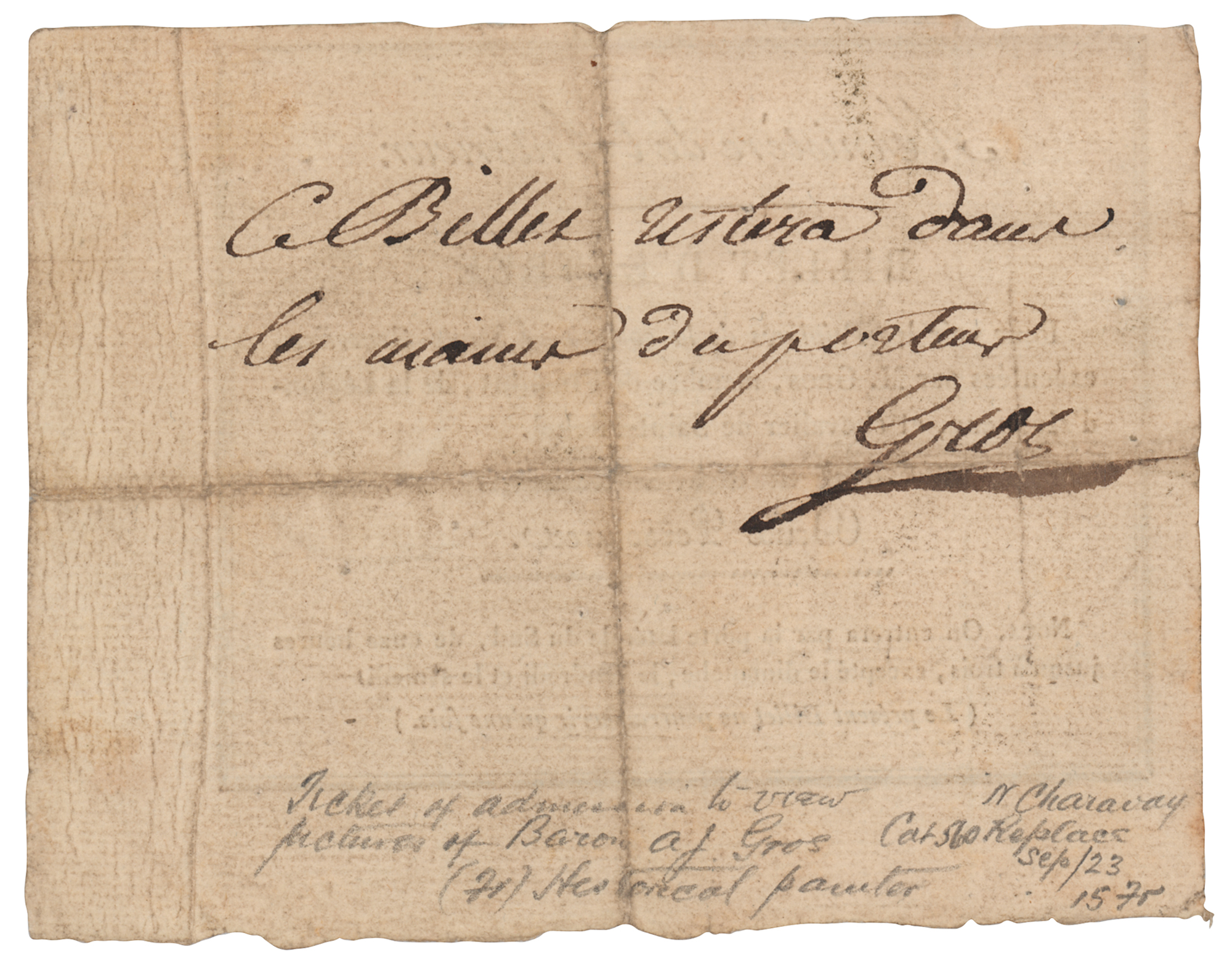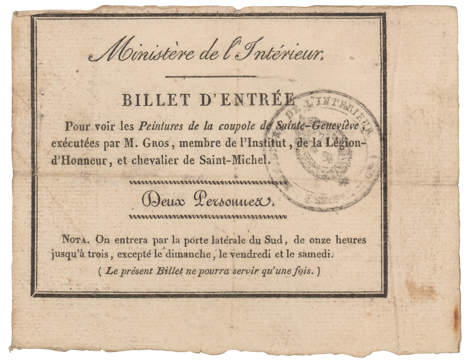 French painter (1771-1835) whose work focused in the genres of history and neoclassical painting. ALS in French, signed “Gros,” one page, 5 x 8, no date. Untranslated handwritten letter to "Mon cher Demarest," with accompanying ticket to view "les Peintures de la coupole de Sainte-Genevieve, exceutees par M. Gros," signed on the reverse by Gros. In fine condition. Gros painted 'The Apotheosis of Saint Genevieve' in the interior of the dome of the Panthéon de Paris between 1811 and 1824.