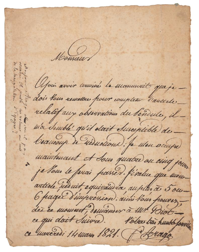 French Catalan mathematician, physicist, astronomer, and politician (1786-1853). ALS in French, signed “F. Arago,” one page, 6.75 x 8.75, March 14, 1821. Untranslated handwritten letter, boldly penned by the French astronomer. In very good to fine condition, with overall light foxing.