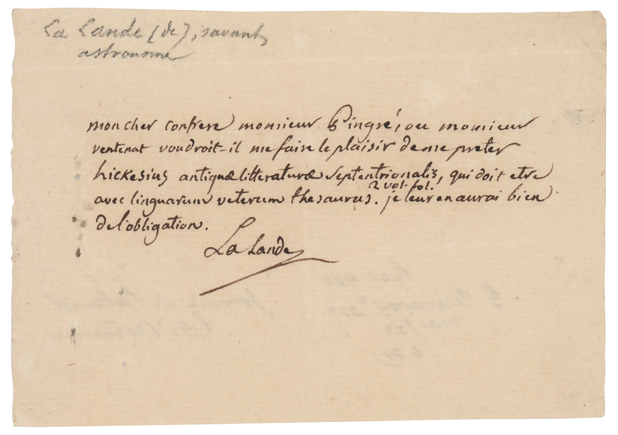 French astronomer and writer (1732-1807). ANS in French, signed “La Lande,” one page, 4.25 x 3, no date. Untranslated handwritten note concerning some antique Latin books. In very good to fine condition.
