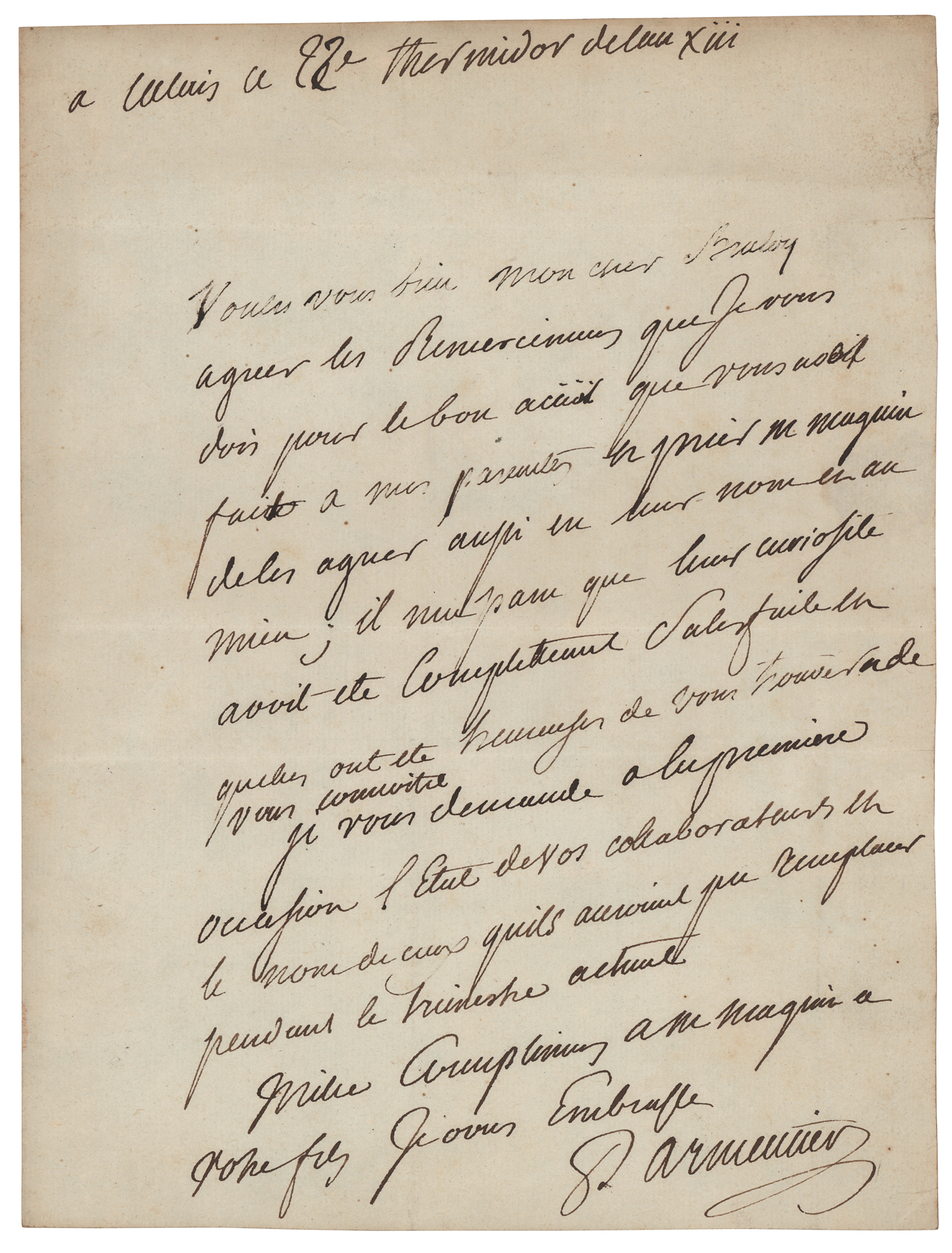 Important contributor to food and nutrition (1737-1813), who was a promoter of the potato as a food source and established the first mandatory smallpox vaccination. ALS in French, signed "Parmentier," one page, 7 x 9.5, August 10, 1805. Untranslated handwritten letter to pharmacist Sabin Joseph Buloy in Boulogne. In fine condition.