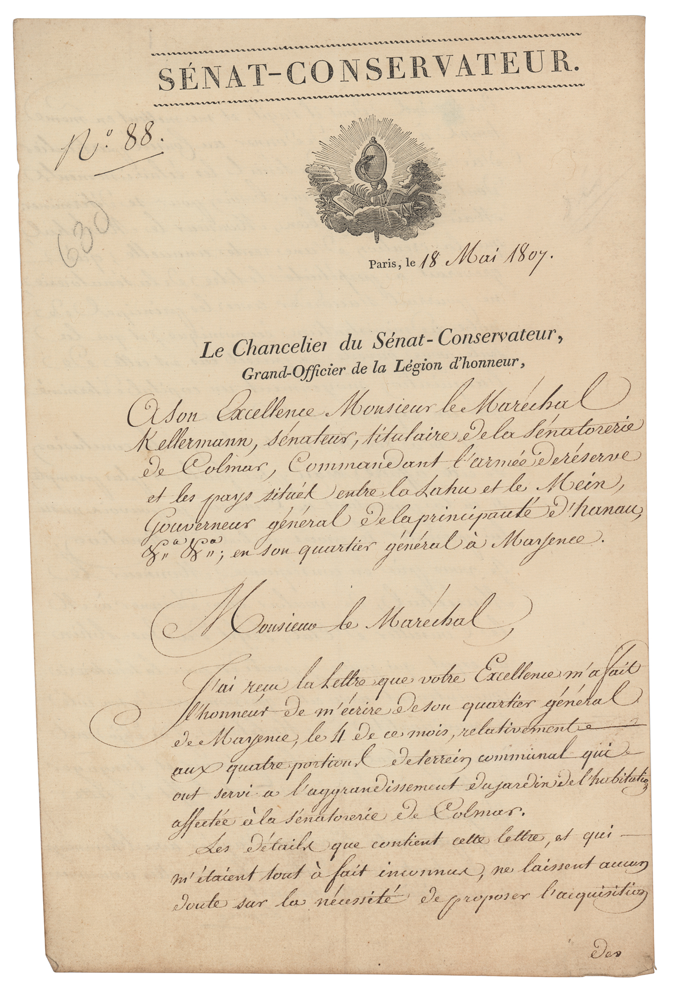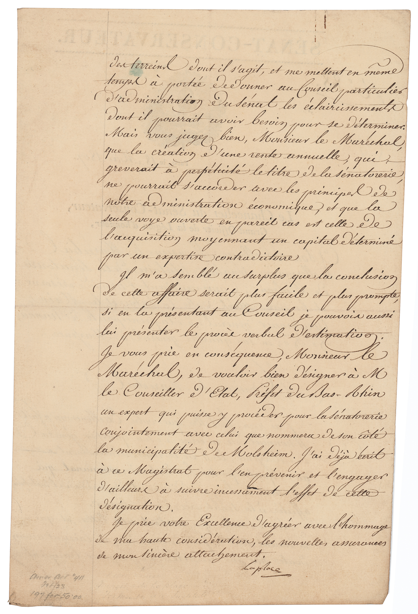French scholar whose work was important to the development of mathematics, statistics, physics, and astronomy (1749-1827). Manuscript DS in French, signed “Laplace,” one page both sides, 7.75 x 12.25, May 18, 1807. Untranslated official document concerning François Christophe de Kellermann, a Marshal of the Empire, signed at the conclusion by Laplace as chancellor of the Senate. In fine condition.