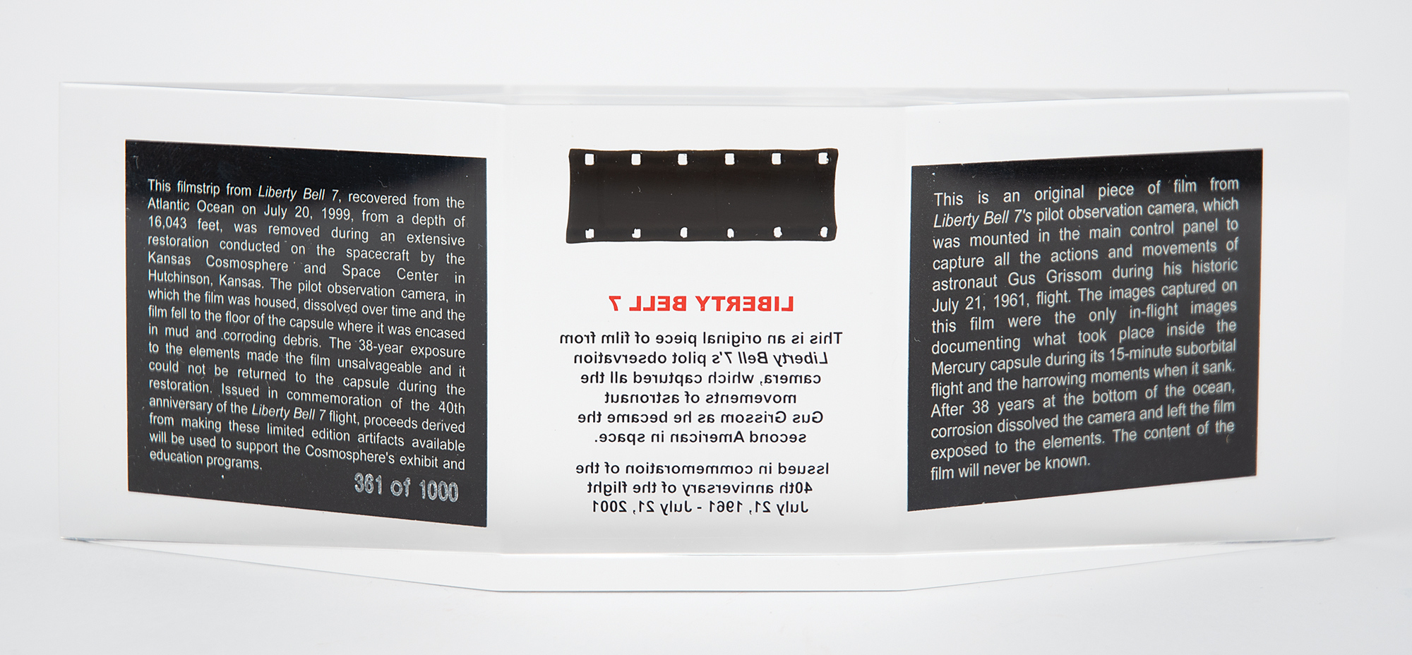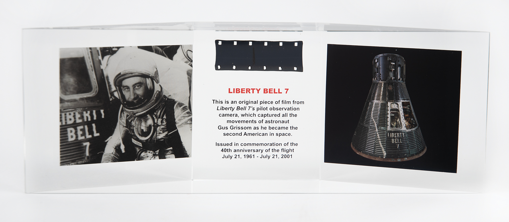 Limited edition flown original piece of film from Gus Grissom’s Liberty Bell 7 Mercury spacecraft, issued in commemoration of the 40th anniversary of the flight, numbered 361/1000. The piece measures approximately 1.75 x .5 and is presented inside an 8.25 x 3 x 1.75 Lucite display with an image of Grissom, the spacecraft, and printed information about the pilot observation camera. Includes its original presentation box with matching number, "361," and a certificate of authenticity from the Kansas Cosmosphere. In fine condition, with some wear to box.