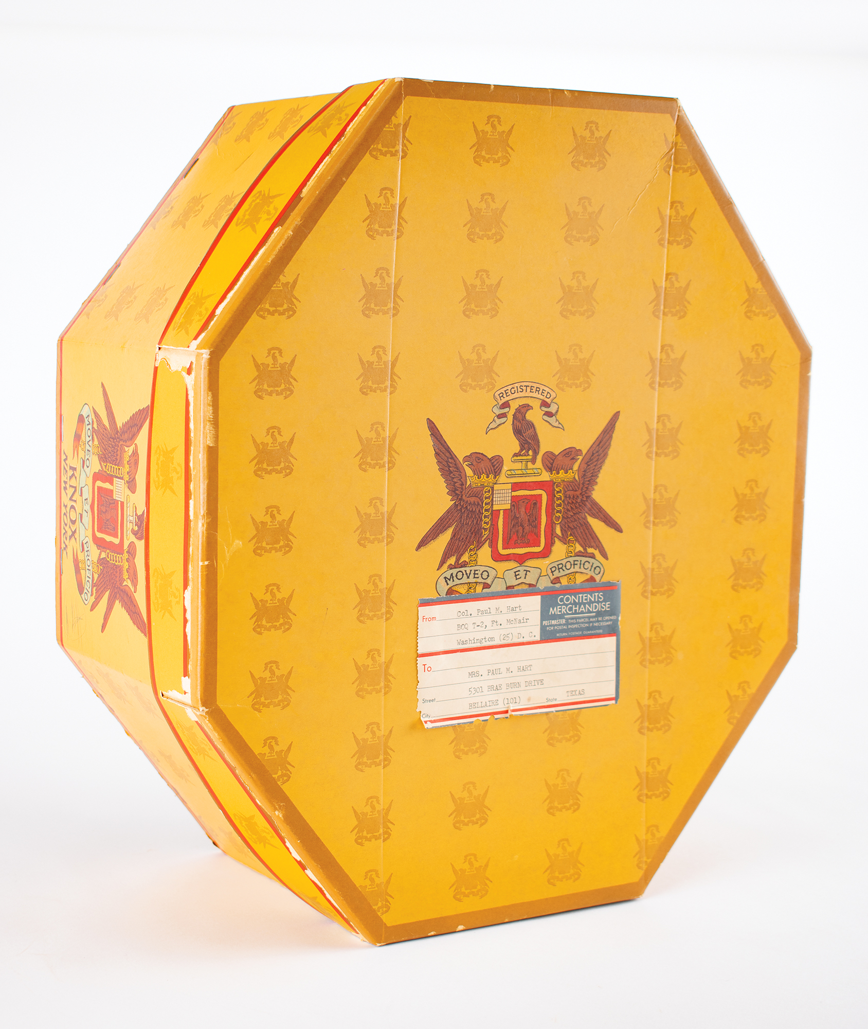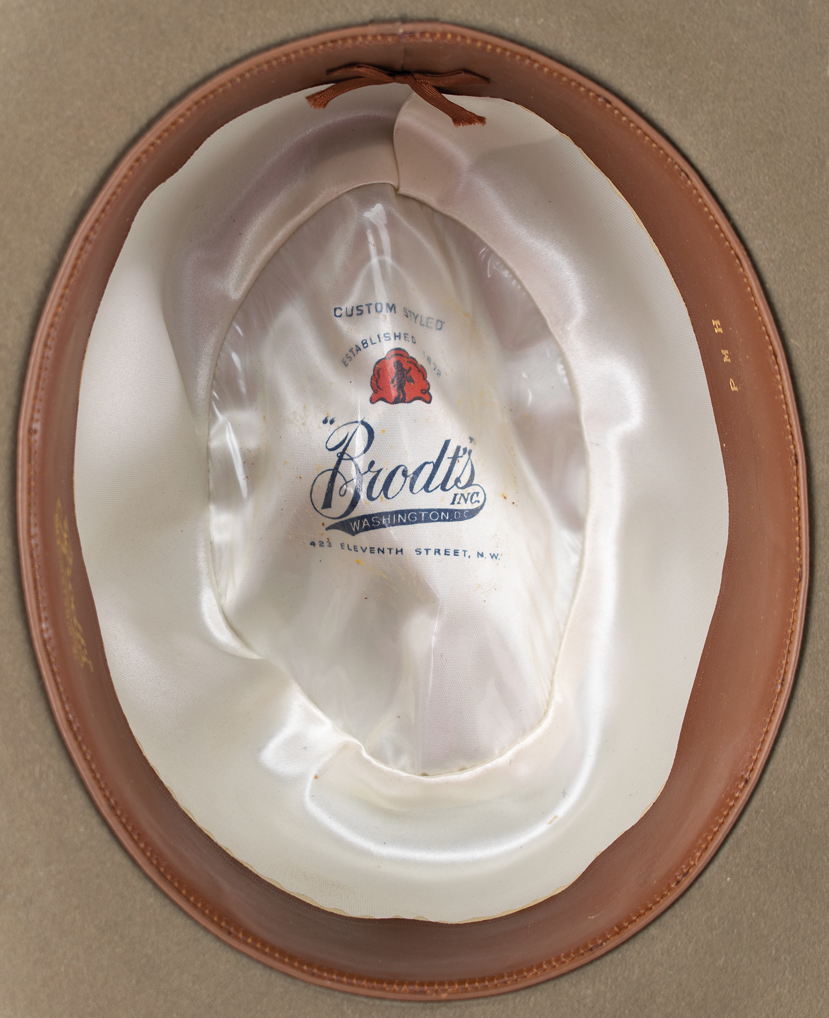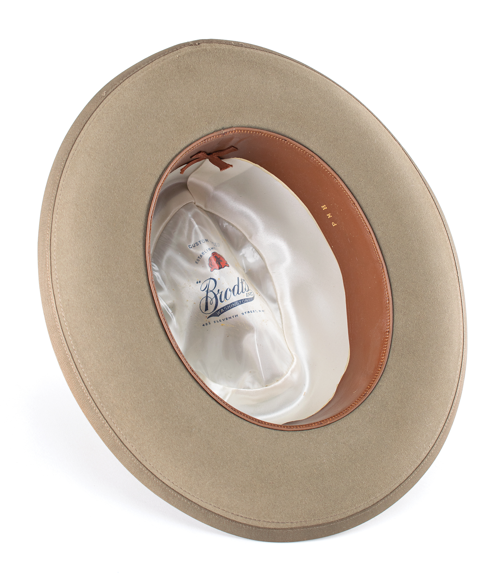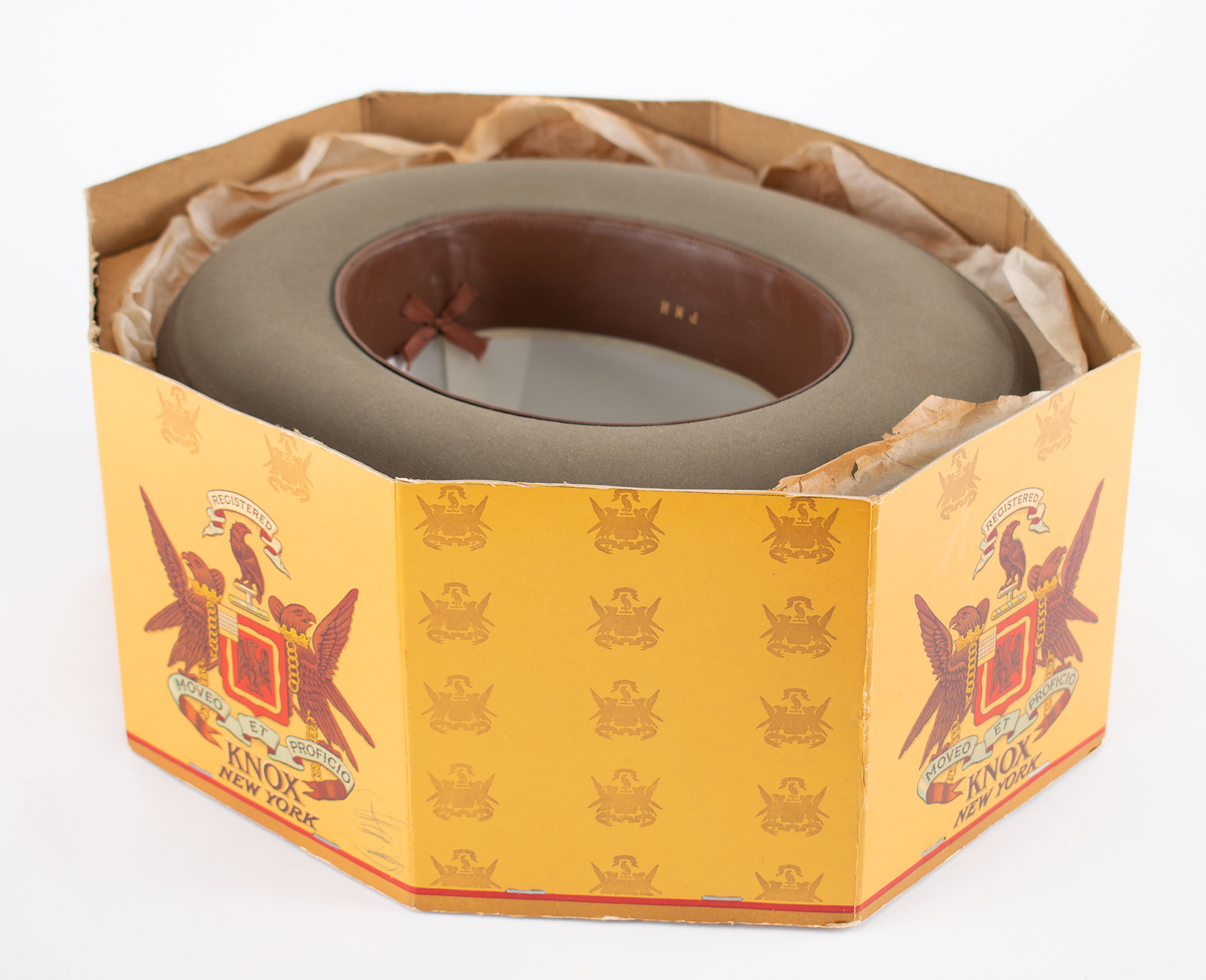 Secret Service agent Paul M. Hart's personally-owned gray fedora hat by Brodt's in Washington, D.C., gilt-stamped inside the leather hatband with his initials: "PMH." Includes the original hatbox with Hart's address label applied to the lid and an original press photo showing Hart—wearing a hat in the same style—protecting President Roosevelt during a picnic at the Grand Coulee Dam. In fine condition.