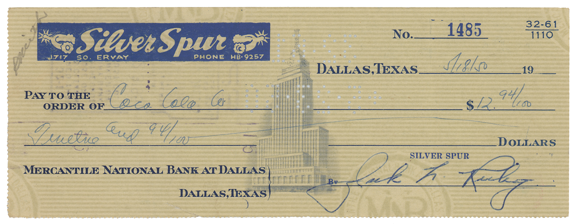 Silver Spur business check, 8.25 x 3, filled out in another hand and signed by Ruby, "Jack L. Ruby," payable to Coca Cola, Co. for $12.94, May 18, 1950. In fine condition. Accompanied by a letter of authenticity from PSA/DNA dated to February 2001.
