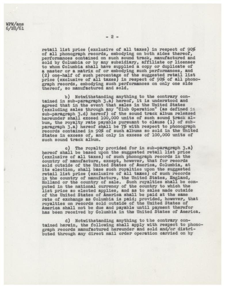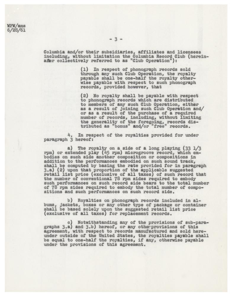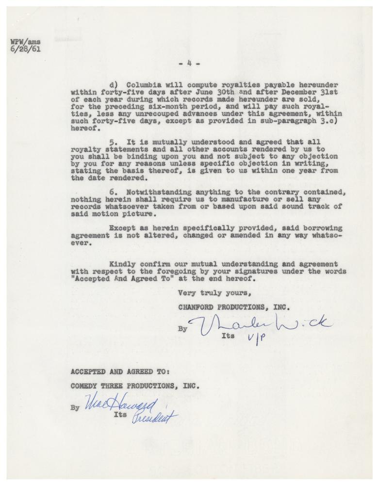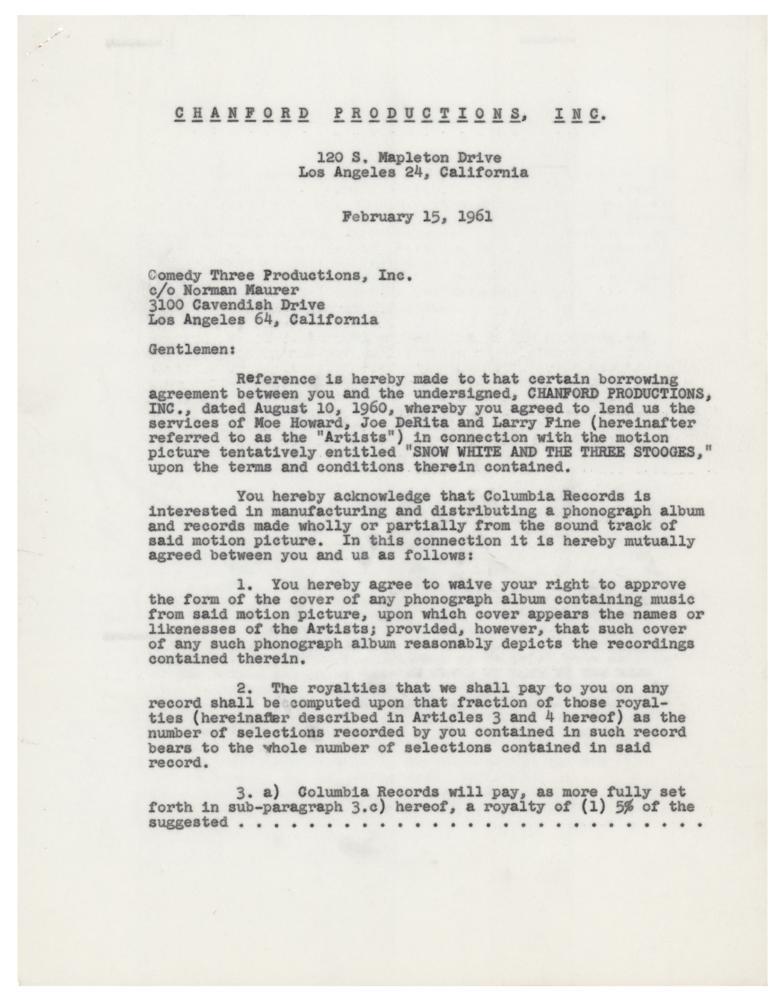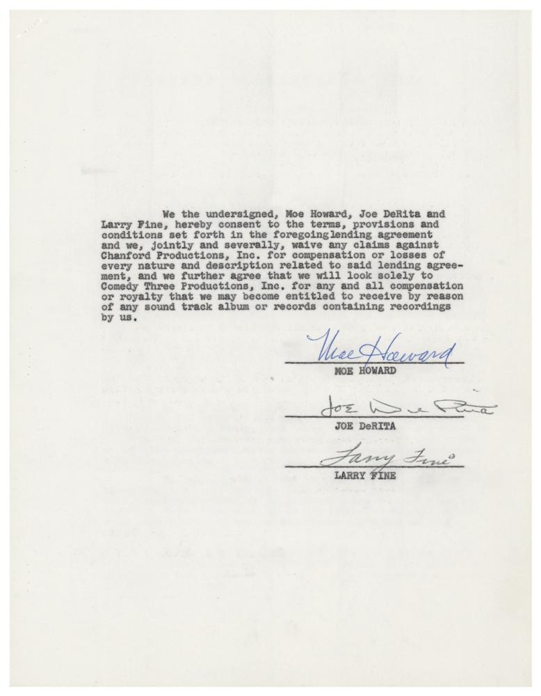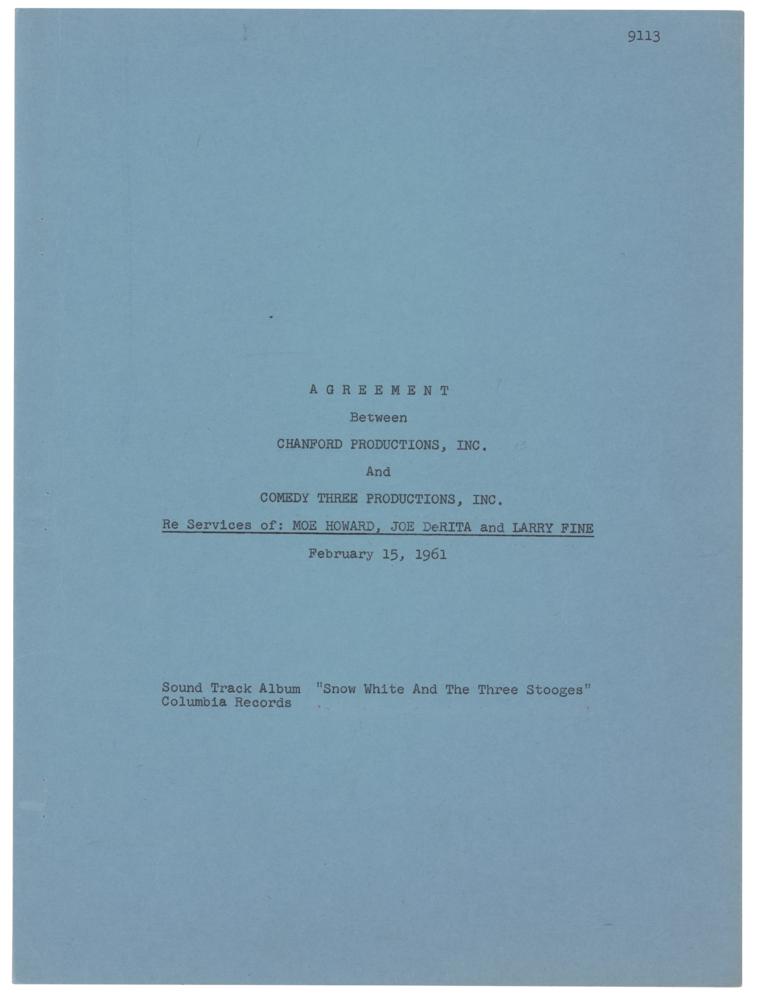 DS, five pages, 8.5 x 11, February 15, 1961. Agreement between the Three Stooges and Chanford Productions concerning royalties for a soundtrack album for "the motion picture tentatively entitled 'Snow White and the Three Stooges.'" Signed on the fourth page in ballpoint by Howard, "Moe Howard, President," and on the next page by all three, "Moe Howard," "Joe DeRita," and "Larry Fine." Includes the original blue legal folder. In fine condition.