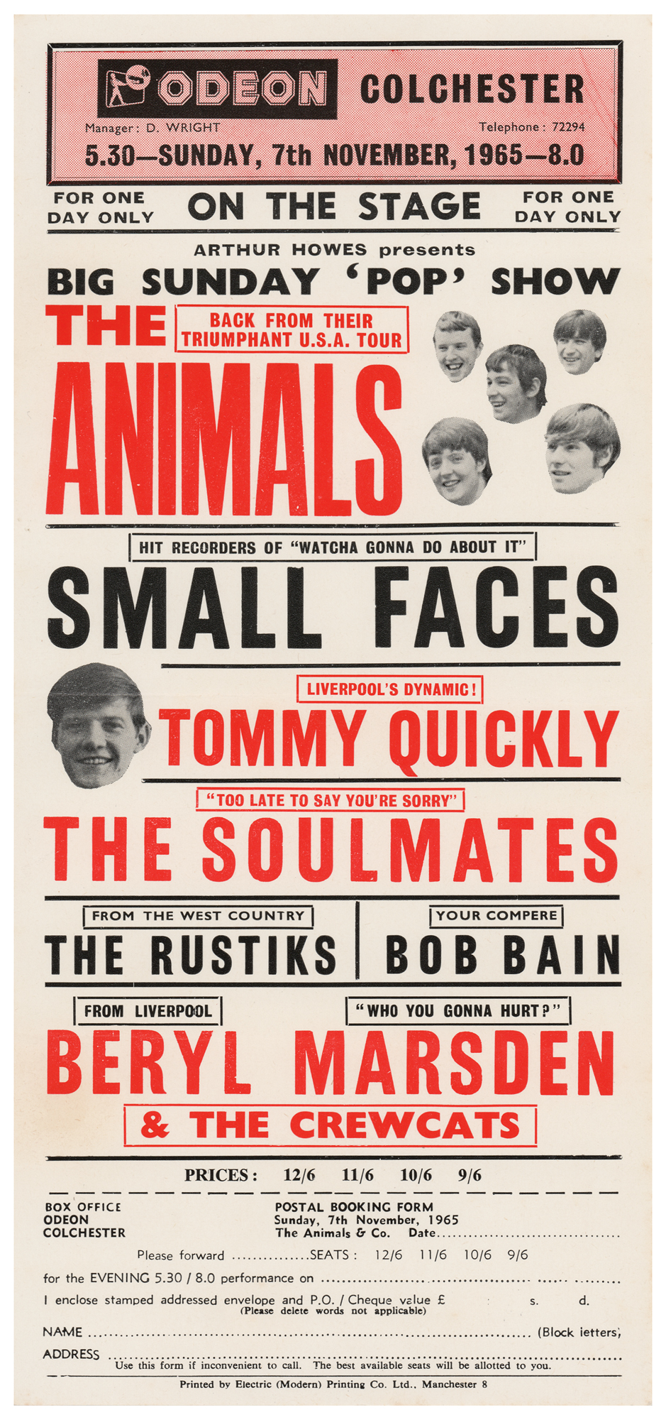 Original color 5.5 x 12 handbill for a “Big Sunday ‘Pop’ Show” concert headlined by the Small Faces and the Animals at the Odeon in Colchester, England, on November 7, 1965, which also lists Tommy Quickly, The Soul Mates, The Rustiks, and Beryl Marsden and The Crewcats. The handbill mentions the Small Face’s hit record ‘Watcha [sic] Gonna Do About It.’ In fine condition.