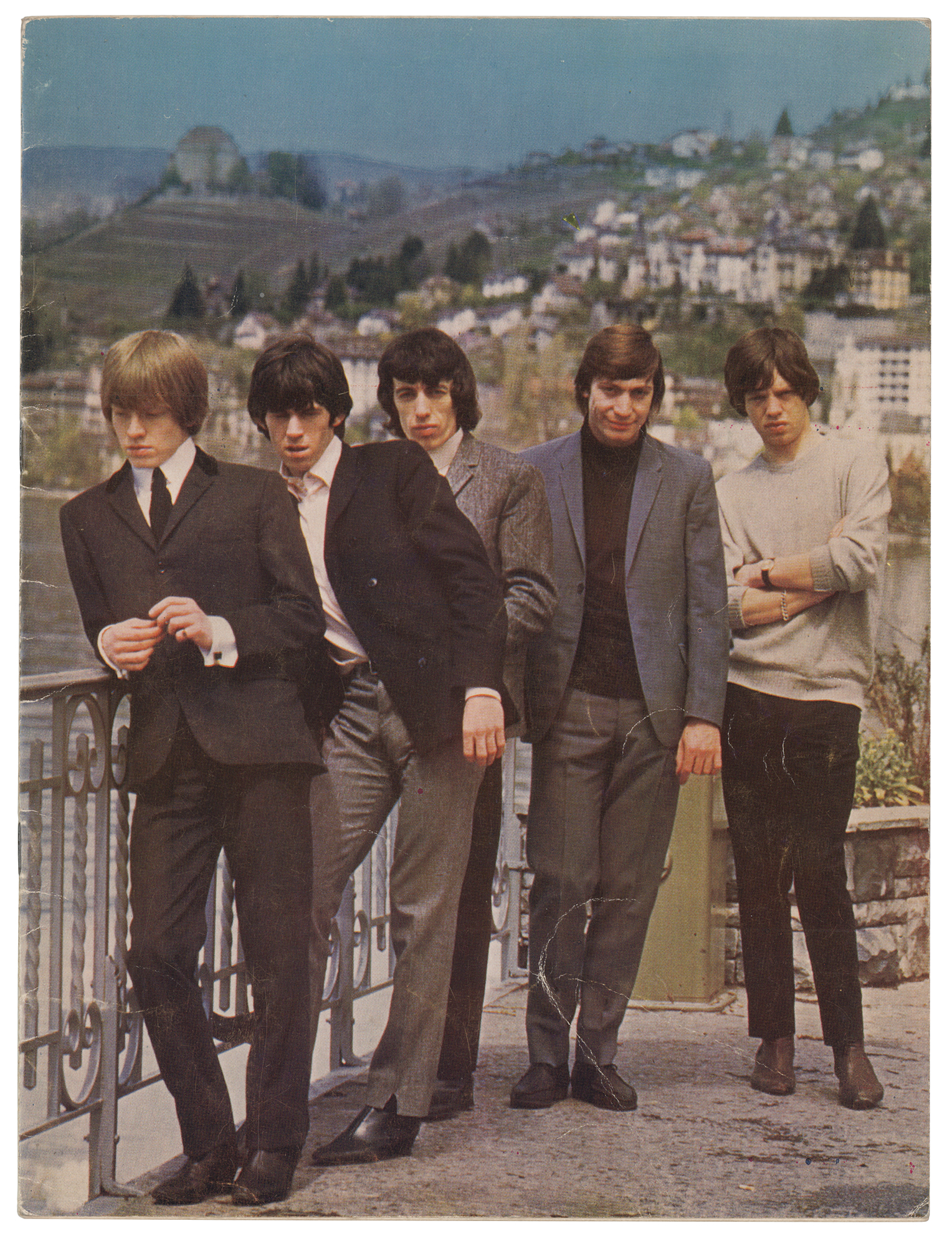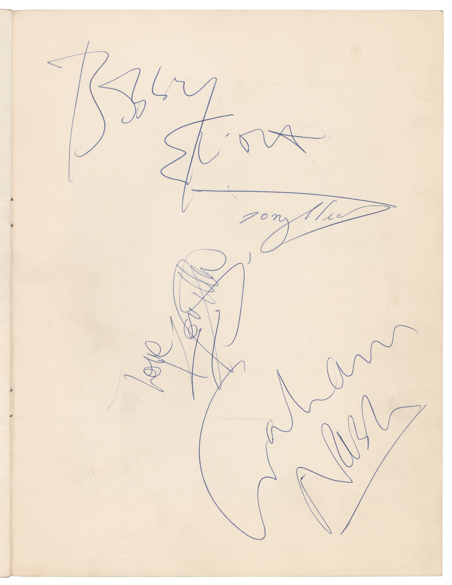 Original souvenir program for the 1965 Spring Tour of the UK by the Rolling Stones, which ran from March 5-16, 1965. The program, 16 pages, 8 x 10.5, is signed on the inside back cover in ballpoint, “Love, Keith Richard,” “Tony Hicks,” “Bobby Elliott,” and “Graham Nash.” In very good to fine condition, with creasing and handling wear. Accompanied by a certificate of authenticity from Tracks.