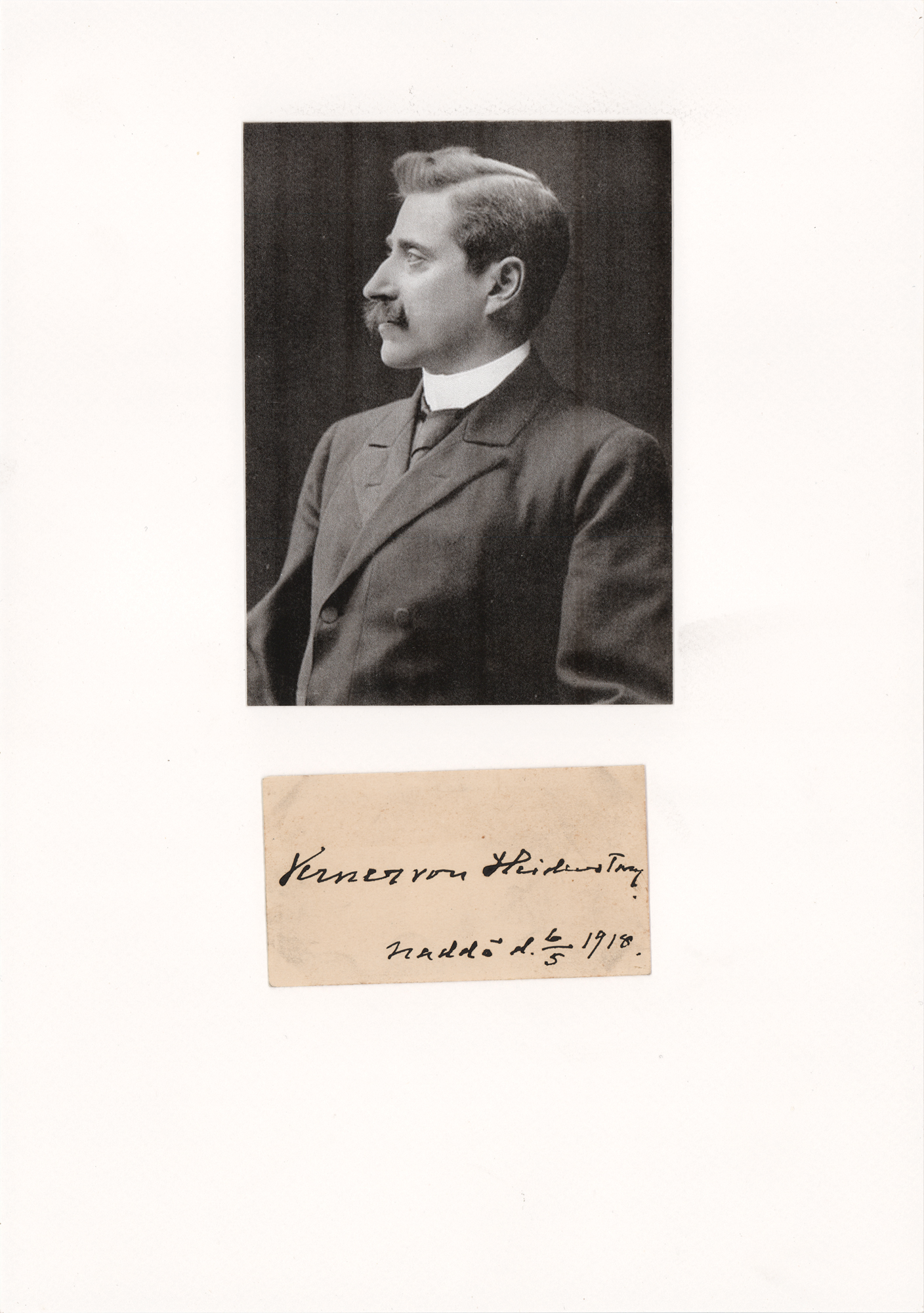 Swedish poet and novelist (1859-1940) who was the laureate of the Nobel Prize in Literature in 1916. Ink signature, "Verner von Heidenstam?6/5 1918,” on an off-white 3.5 x 1.75 card affixed to a larger sheet bearing an applied photo. In fine condition.