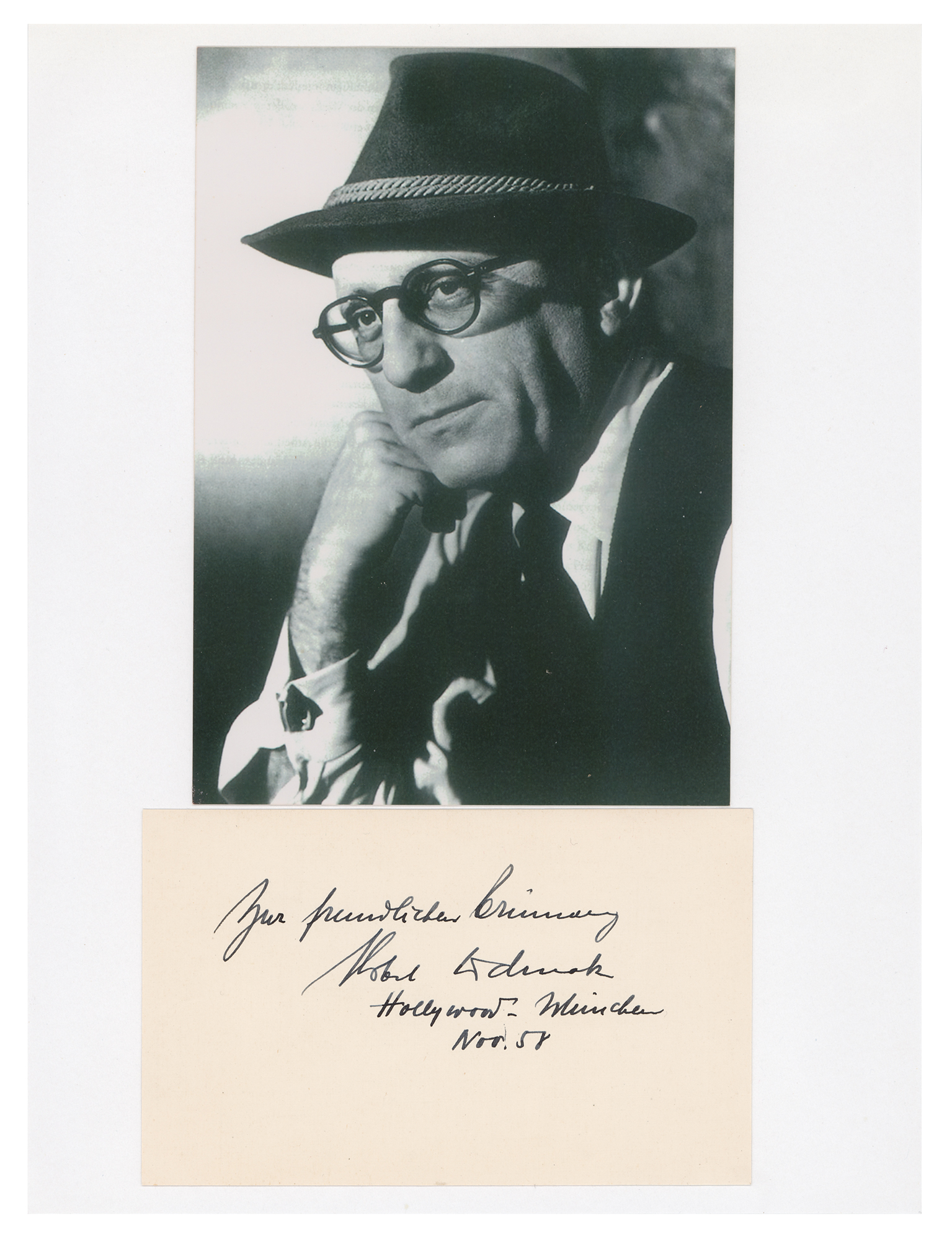 German film director (1900-1973) known for his melodramatic noir thrillers like The Killers. Fountain pen signature, "Robert Siodmak, Hollywood-Munchen, Nov. 58,” on an off-white 5.75 x 3.5 card affixed to a larger white sheet bearing an applied photo. In fine condition.