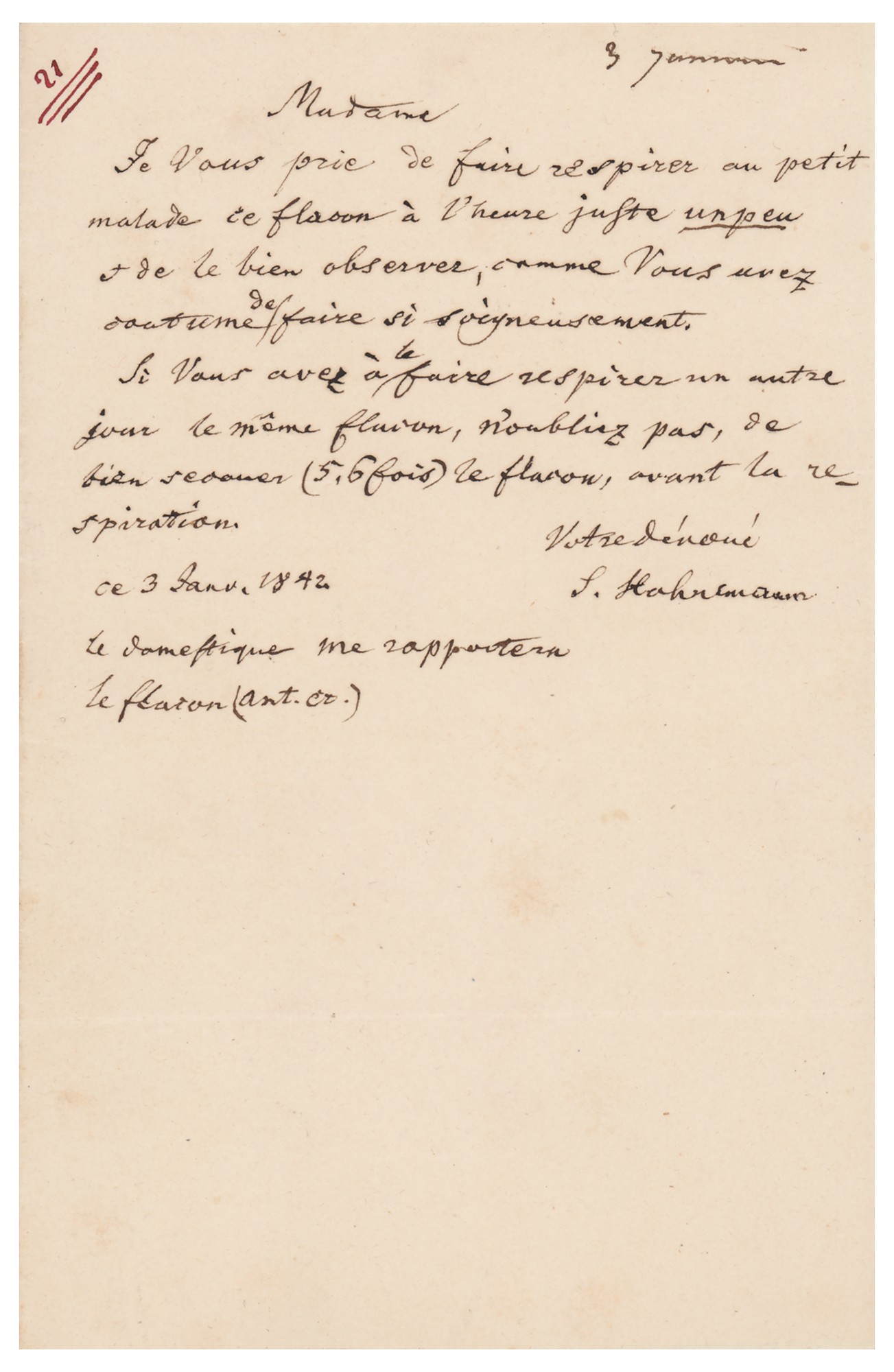 German physician best known for creating a system of alternative medicine called homeopathy (1755-1843). Rare ALS in French, signed “S. Hahnemann,” one page, 3.75 x 6, January 3, 1842. Handwritten prescription to a lady, in part (translated): "I ask you to have the child that is ill breathe the small bottle at the right time just a little and to observe his reaction as you use to do so carefully. If you have to make the child breathe another day the same small bottle please do not forget to shake it five or six times before the respiration...P.S. Your servant will bring me back the small bottle (ant.CR.)" In fine condition. Rare and important medical instructions from the creator of homeopathy.