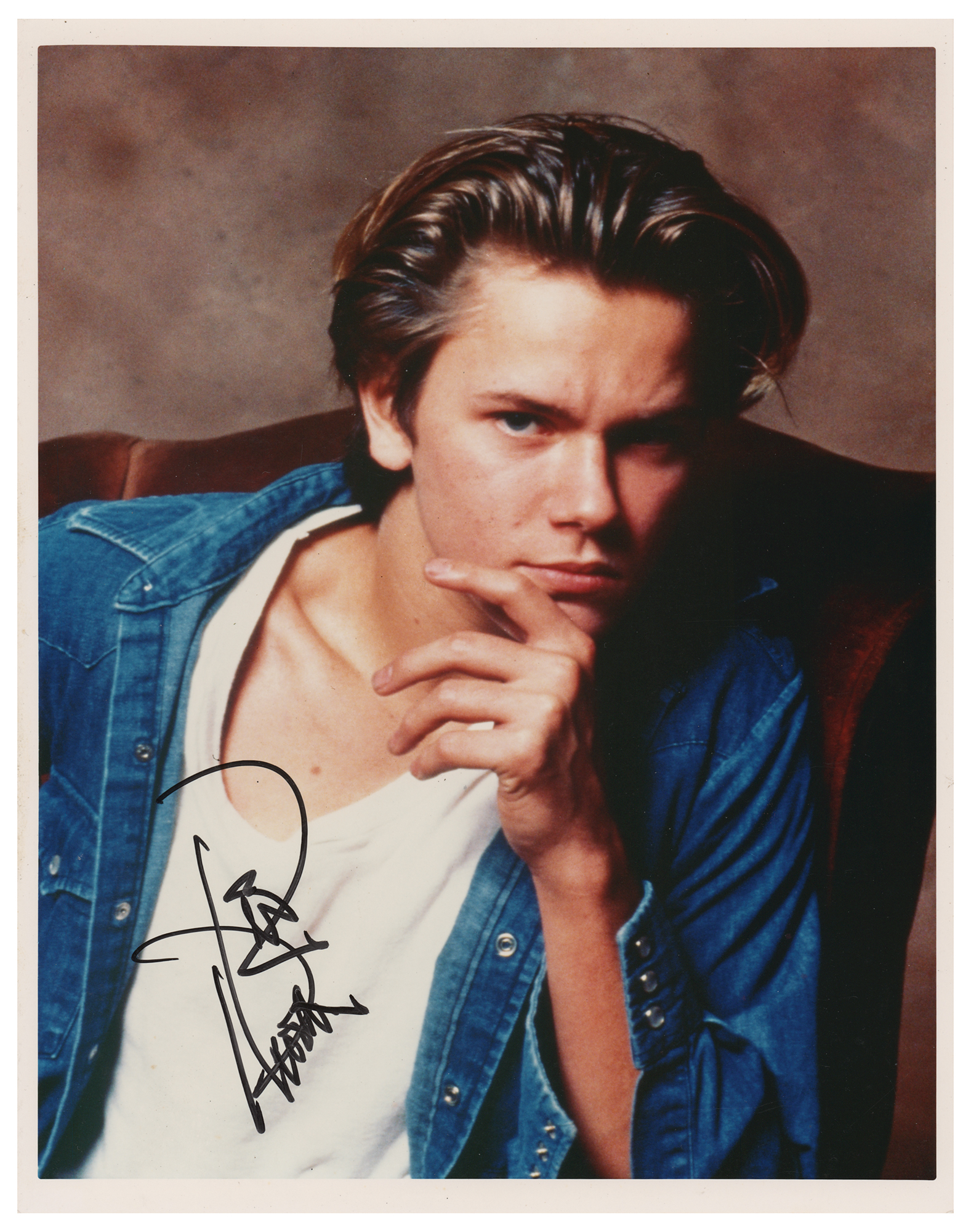 Classic color glossy 8 x 10 photo of River Phoenix in a denim jacket, boldly signed in black felt tip. In fine condition.