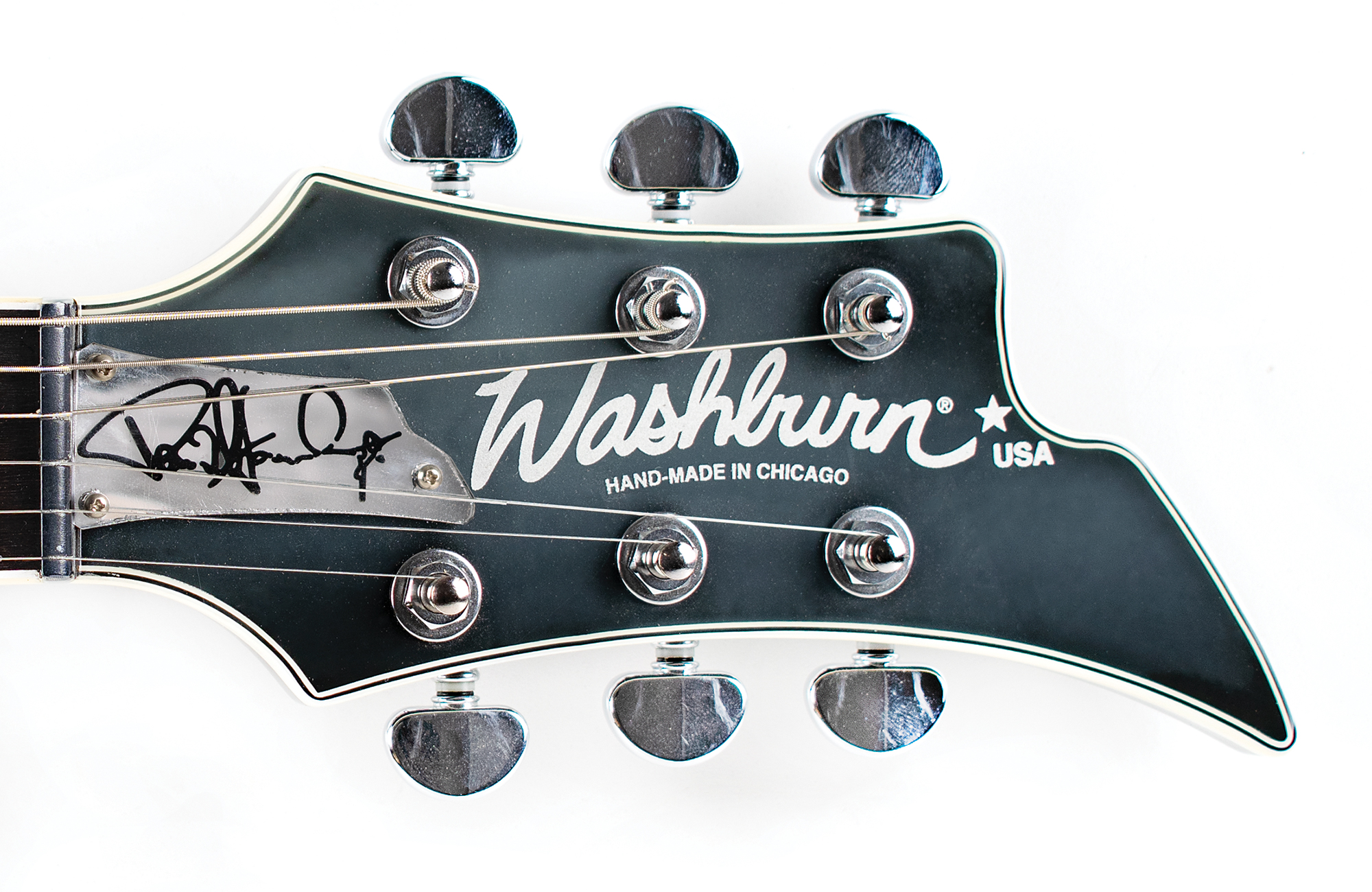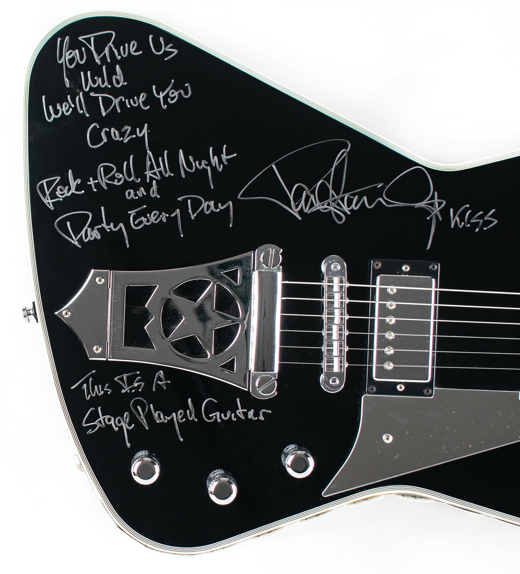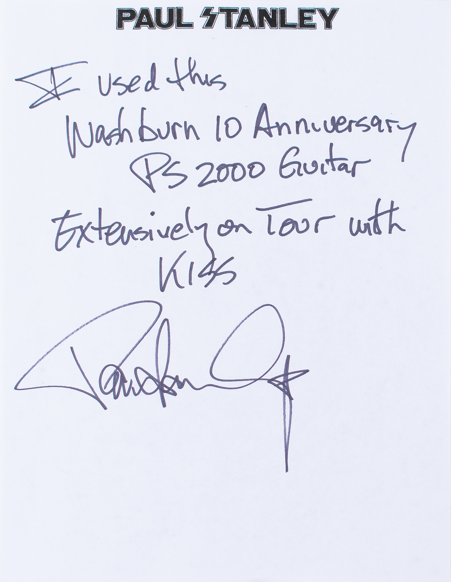 Gorgeous black-bodied Washburn PS2000 electric guitar used on stage by KISS guitarist Paul Stanley, signed on the body in silver ink, “Paul Stanley, KISS, This is a stage played guitar,” with Stanley adding lyrics to the song ‘Rock and Roll All Nite’— “You drive us wild, we’ll drive you crazy, rock + roll all night and party every day.” The bottom curve of the guitar body is lined with 40 affixed KISS / Paul Stanley guitar picks. The guitar features white binding to neck and headstock, a mirror pickguard, chrome hardware, and a slim mahogany neck with an ebony fretboard and mother of pearl/abalone inlays. Includes a signed handwritten statement of authenticity: “I used this Washburn 10 Anniversary PS 2000 guitar extensively on tour with KISS. Paul Stanley.” In fine condition. Accompanied by a custom G&G hardshell carrying case. A beautiful stage-used guitar backed by provenance from one of rock's most influential players.