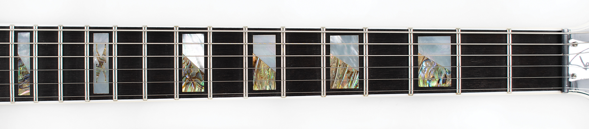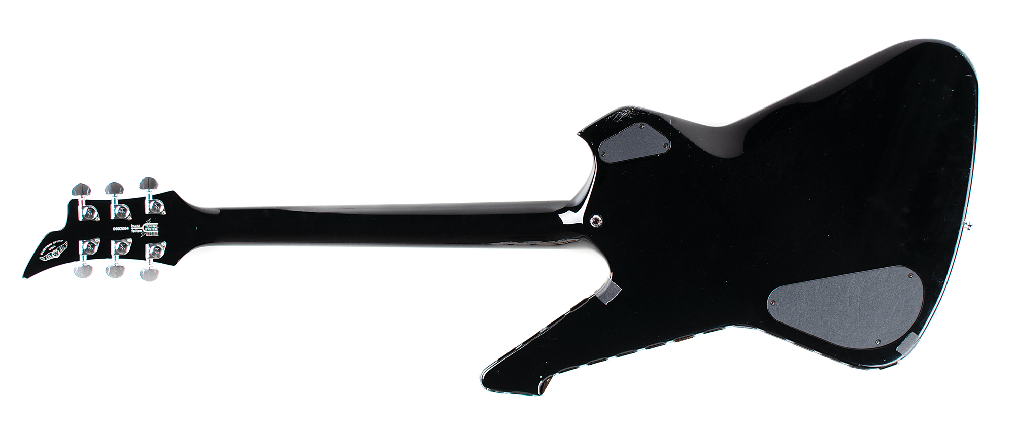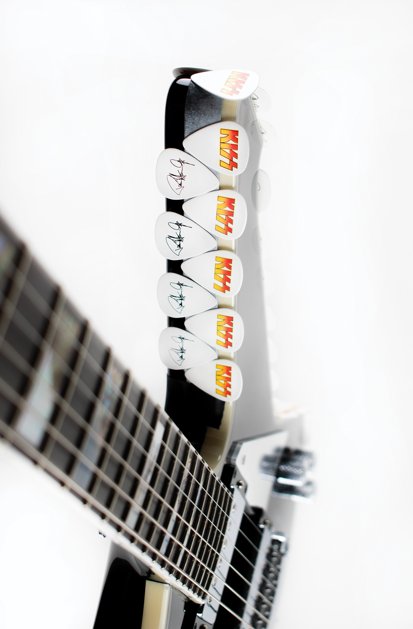 Gorgeous black-bodied Washburn PS2000 electric guitar used on stage by KISS guitarist Paul Stanley, signed on the body in silver ink, “Paul Stanley, KISS, This is a stage played guitar,” with Stanley adding lyrics to the song ‘Rock and Roll All Nite’— “You drive us wild, we’ll drive you crazy, rock + roll all night and party every day.” The bottom curve of the guitar body is lined with 40 affixed KISS / Paul Stanley guitar picks. The guitar features white binding to neck and headstock, a mirror pickguard, chrome hardware, and a slim mahogany neck with an ebony fretboard and mother of pearl/abalone inlays. Includes a signed handwritten statement of authenticity: “I used this Washburn 10 Anniversary PS 2000 guitar extensively on tour with KISS. Paul Stanley.” In fine condition. Accompanied by a custom G&G hardshell carrying case. A beautiful stage-used guitar backed by provenance from one of rock's most influential players.