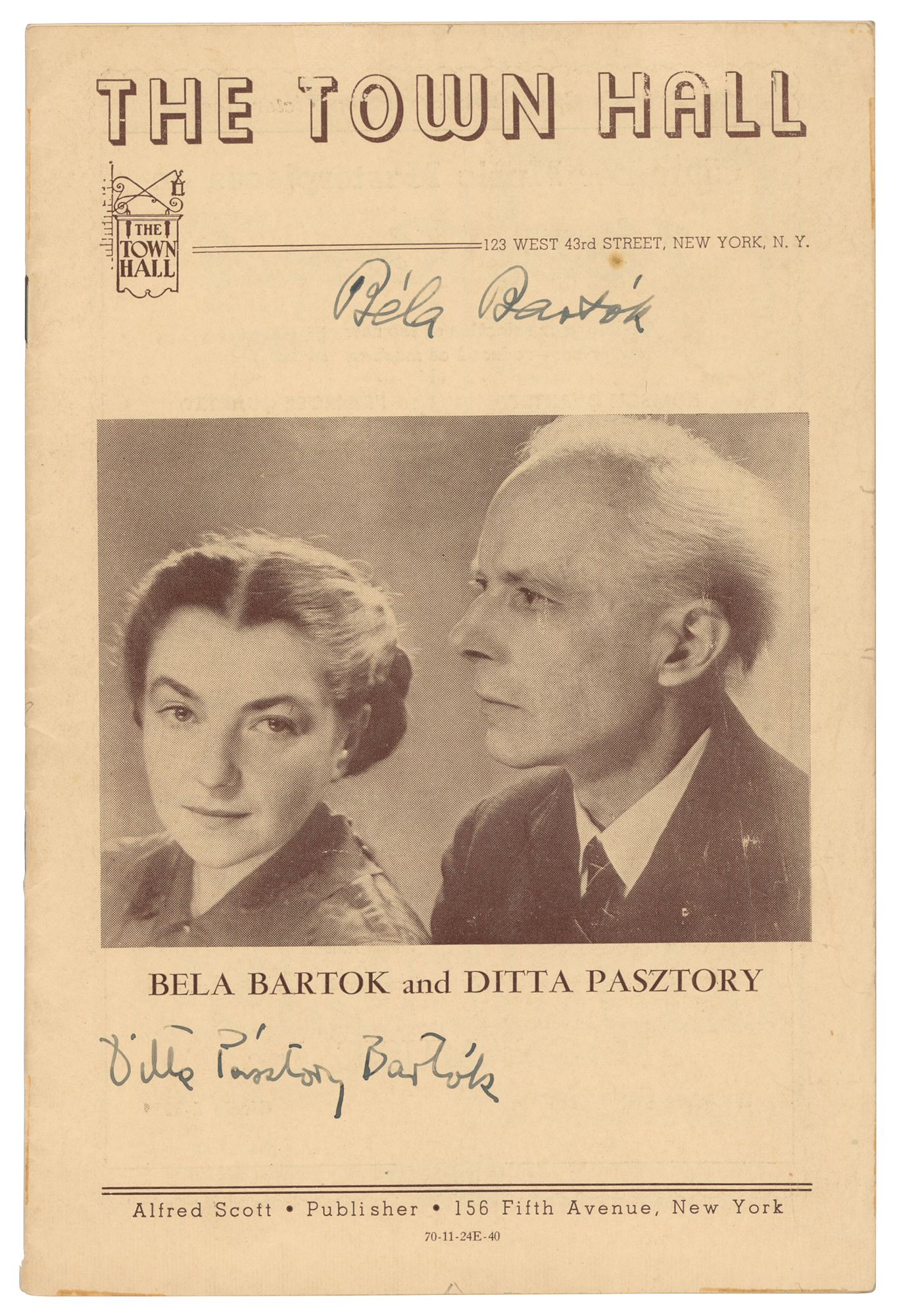 Program for Bela Bartok and his wife, the pianist Ditta Pasztory, at the Town Hall in New York on November 24, 1940, 14 pages, 6 x 9, signed on the front cover in fountain pen, "Bela Bartok" and "Ditta Pasztory Bartok." In fine condition, with light handling wear.
