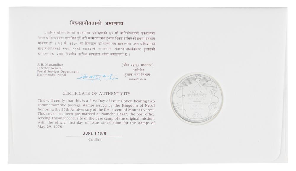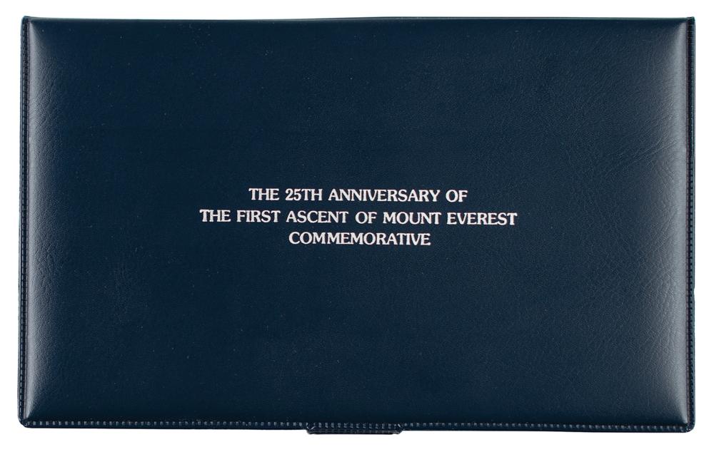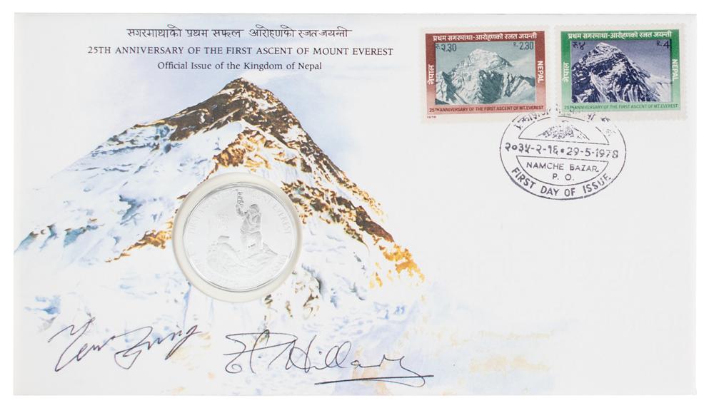 Commemorative cover with a cachet and inlaid medallion honoring the 25th anniversary of the first ascent of Mount Everest, 8 x 4.5, signed in black ballpoint by Edmund Hillary and Tenzing Norgay. Housed in its original presentation folder. In fine condition.