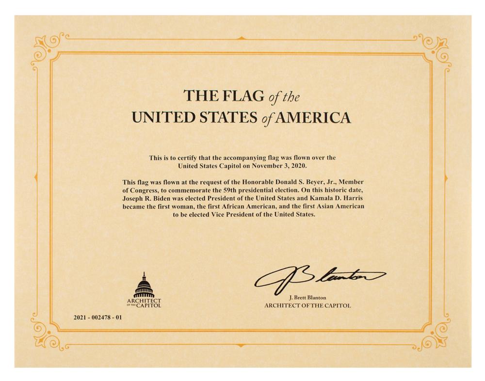 Very desirable 5´ x 8´ nylon American flag that was flown over the United States Capitol on November 3, 2020, the date of the United States presidential election. Includes a printed presentation certificate from Architect of the Capitol J. Brett Blanton, in part: “This is to certify that the accompanying flag was flown over the United States Capitol on November 3, 2020. The flag was flown at the request of the Honorable Donald S. Beyer, Jr., Member of Congress, to commemorate the 59th presidential election. On this historic occasion, Joseph R. Biden was elected President of the United States and Kamala D. Harris became the first woman, first African American, and first South Asian American to be elected Vice President of the United States." In very fine condition. Accompanied by the original box.