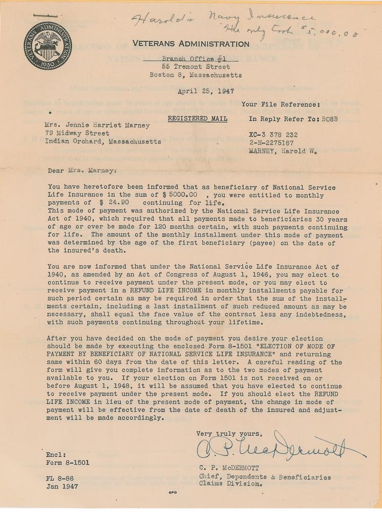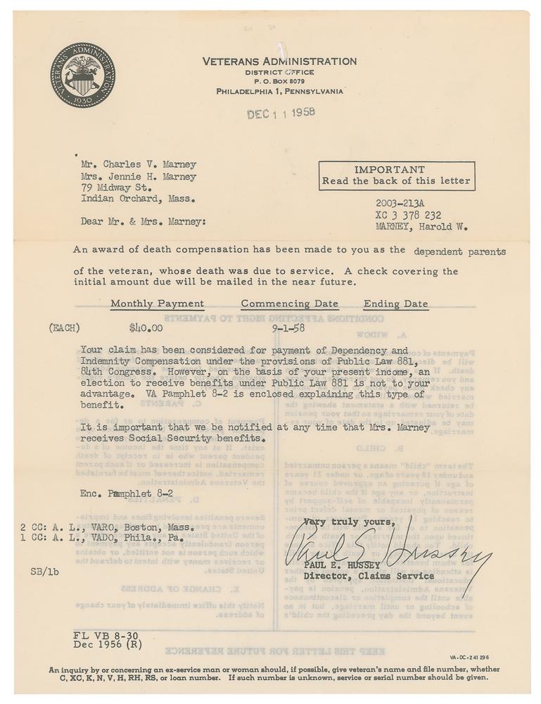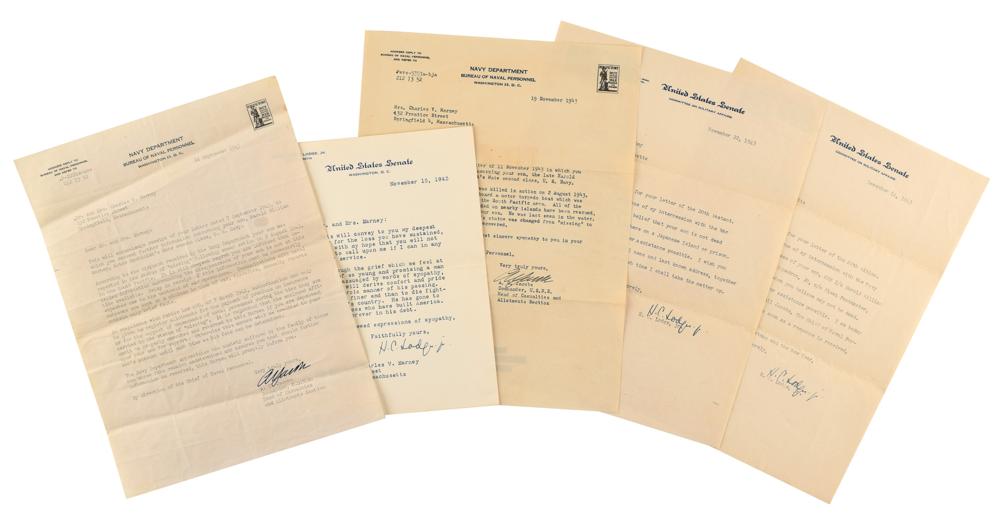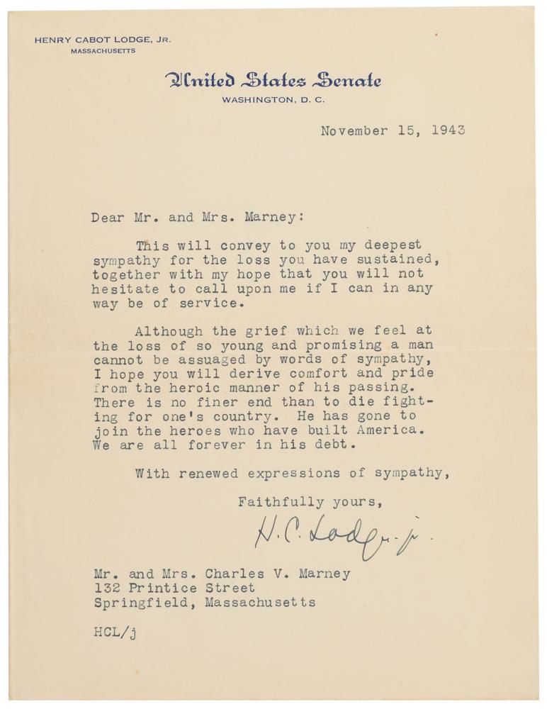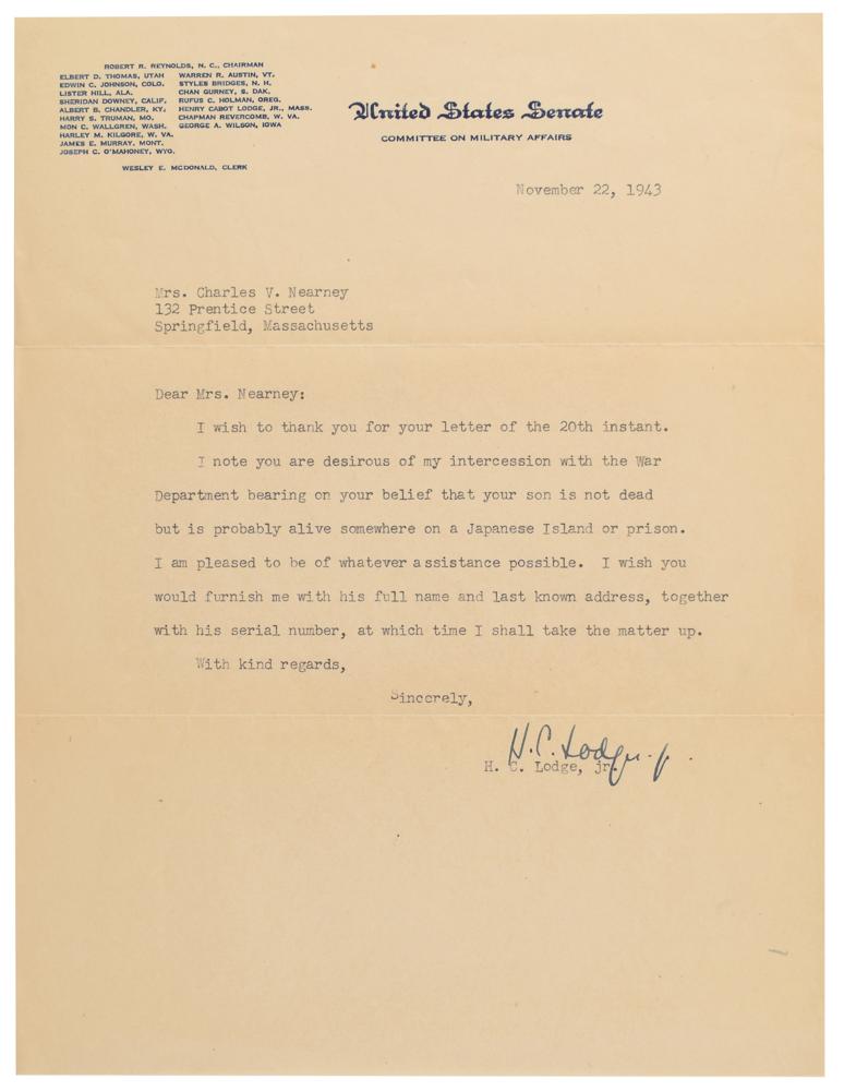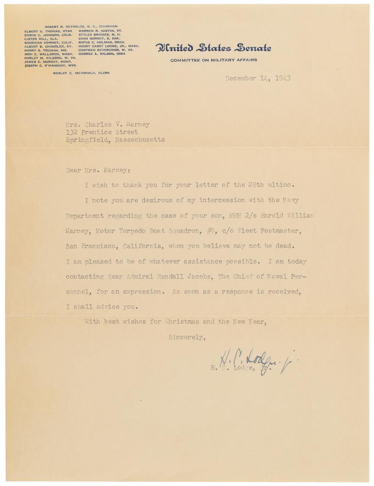 This archive includes three letters that Massachusetts Senator Henry Cabot Lodge wrote Mrs. Marney in responding to her asking for his help in getting more information about her son, despite the letters she had already received from Kennedy telling her that her son was dead. In one of these letters Lodge responds to Mrs. Marney’s feelings of “belief that your son is not dead but is probably alive somewhere on a Japanese Island or prison.” Also included are typed letters with secretarial signatures of Senator Kennedy to Mrs. Marney in 1958 and 1959, where Kennedy interceded on her behalf for social security benefits and other issues that he tried to help her with.