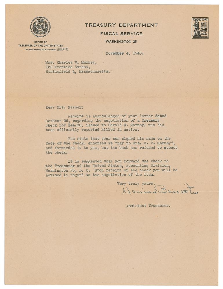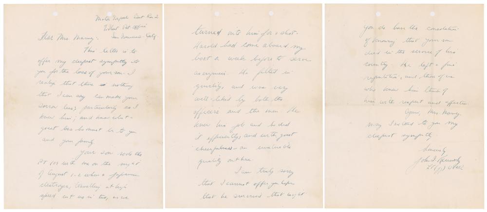 Highlights of this correspondence include two handwritten letters that Kennedy wrote to Mrs. Marney in late September 1943 from Chelsea Naval Hospital, where Kennedy was recuperating from his back injury caused by the PT-109 collision with the Amagiri, responding to her inquiry regarding any information about her son, after receiving official notification that Harold was missing. Kennedy writes two poignant and compassionate letters to Mrs. Marney. In the first he writes, “This letter is to offer my deepest sympathy to you for the loss of your son. I realize that there is nothing that can say [that] can make your sorrow less; particularly as I knew him; and know what a great loss he must be to you and your family. Your son rode the PT 109 with me on the night of August 1-2 when a Japanese destroyer, travelling at high speed cut us in two, as we turned into him for a shot. Harold had come aboard my boat a week before to serve as engineer. He fitted in quickly, and we very well-liked by both the officers and the men. He knew his job and he did it effectively, and with great cheerfulness—an invaluable quality out here. I am truly sorry that I cannot offer you hope that he survived that night. You do have the consolation of knowing that your son died in the service of his country. He left a fine reputation, and those of us who knew him think of him with respect and affection. Again, Mrs. Marney, may I extend to you my deepest sympathy.”