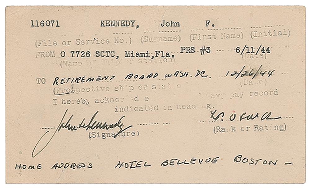 - John F. Kennedy’s signed “retirement card” from the Navy, June 11, 1944, listing his “Home Address, Hotel Bellevue—Boston”