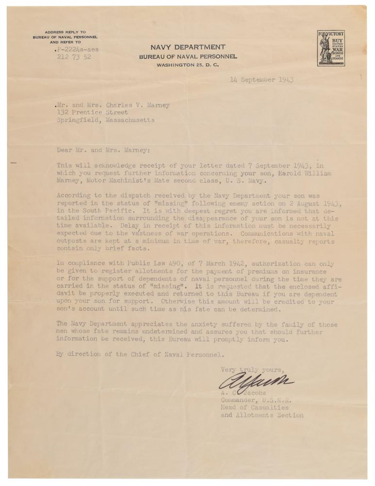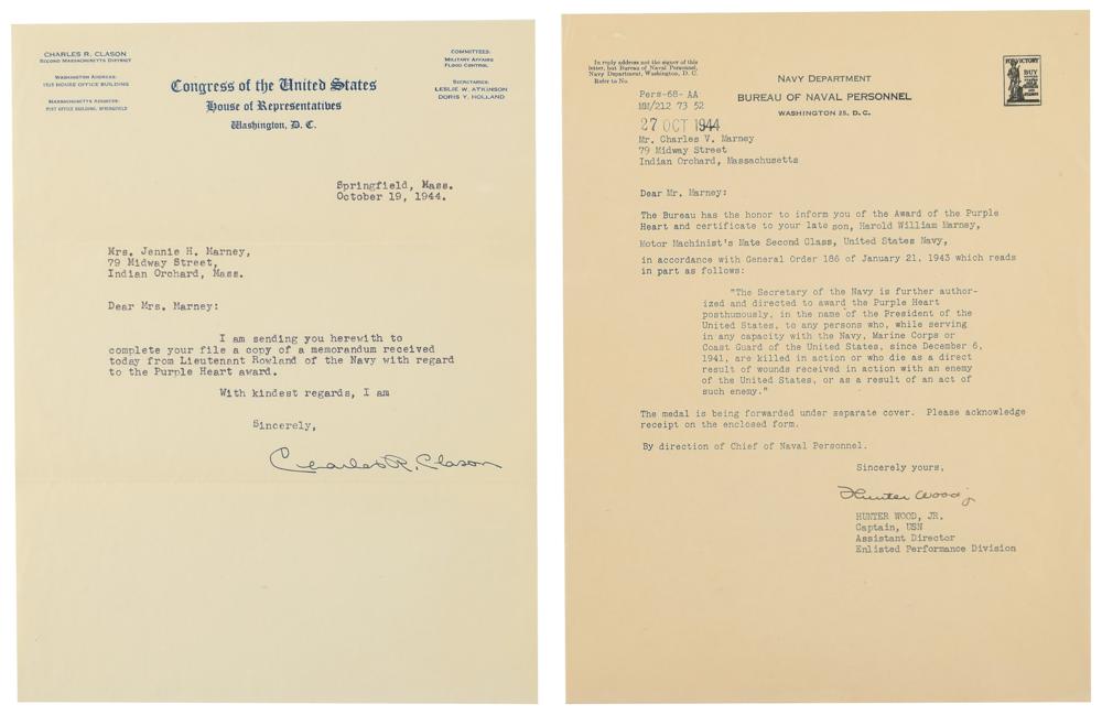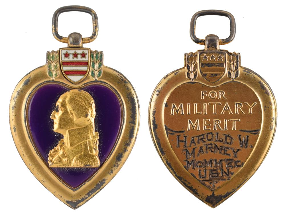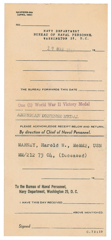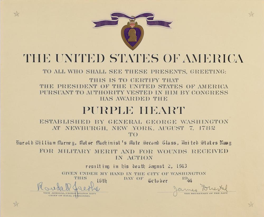 Significantly Harold Marney’s Purple Heart inscribed on the back “FOR MILITARY MERIT HAROLD W. MARNEY MOMM 2c USN,” and citation from October 16, 1944 for “MILITARY MERIT AND FOR WOUNDS RECEIVED IN ACTION resulting in his death August 2, 1943” is part of this archive.
