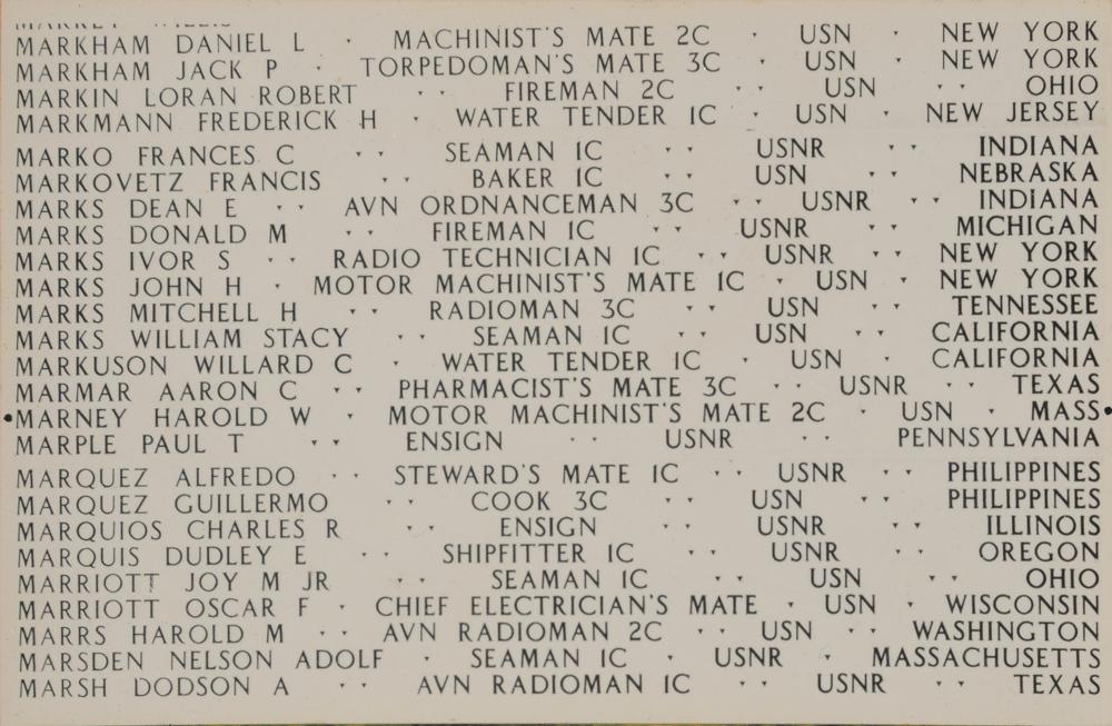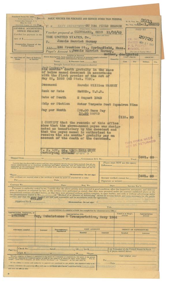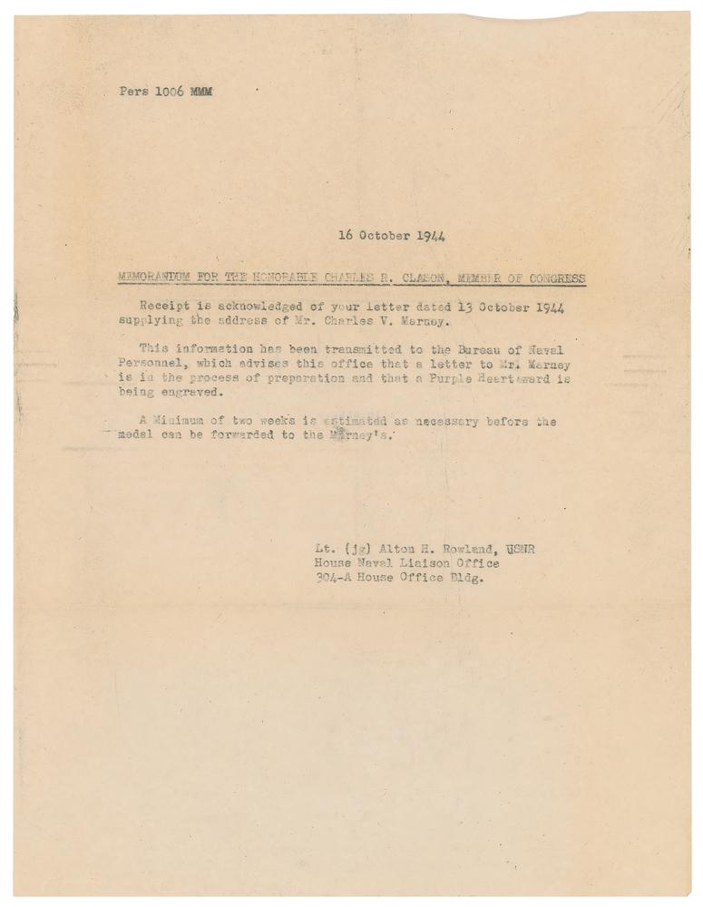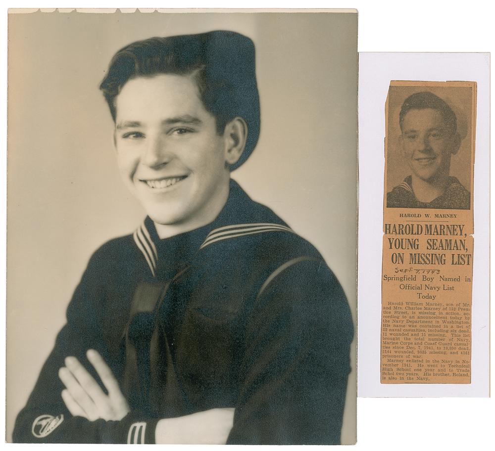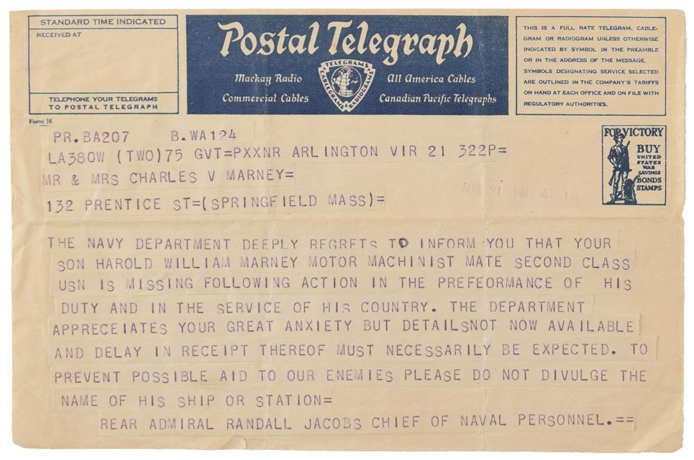 Significantly Harold Marney’s Purple Heart inscribed on the back “FOR MILITARY MERIT HAROLD W. MARNEY MOMM 2c USN,” and citation from October 16, 1944 for “MILITARY MERIT AND FOR WOUNDS RECEIVED IN ACTION resulting in his death August 2, 1943” is part of this archive.