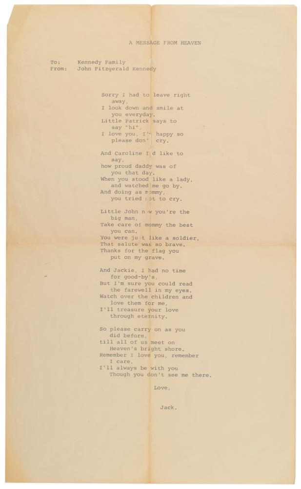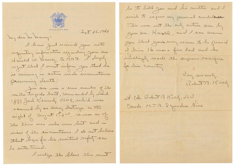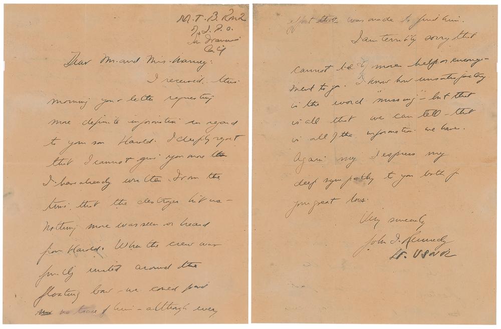 Unique, extraordinary, and historically significant JFK correspondence archive from the family of a PT-109 sailor lost at sea