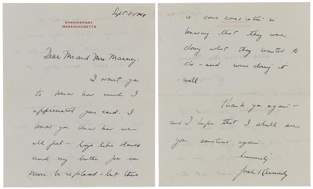 The third handwritten letter in response to a condolence card that Mrs. Marney sent Kennedy, after his brother Joe was killed in action flying over Germany during a secret mission on August 15, 1944. It reads: “I want you to know how much I appreciated your card. I know you know how we all feel—boys like Harold and my brother Joe can never be replaced—but there is some consolation in knowing that they were doing what they wanted to do—and were doing it well. Thank you again and I hope that I shall see you sometime again.”