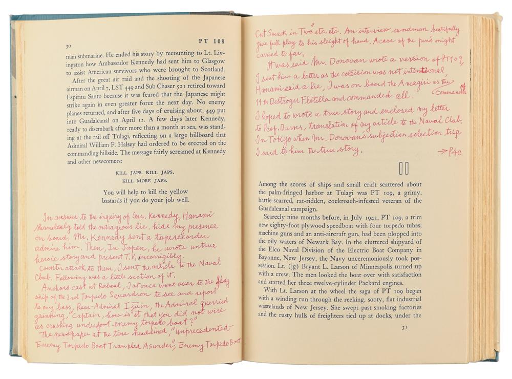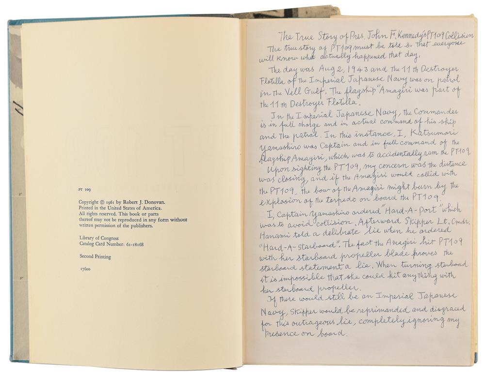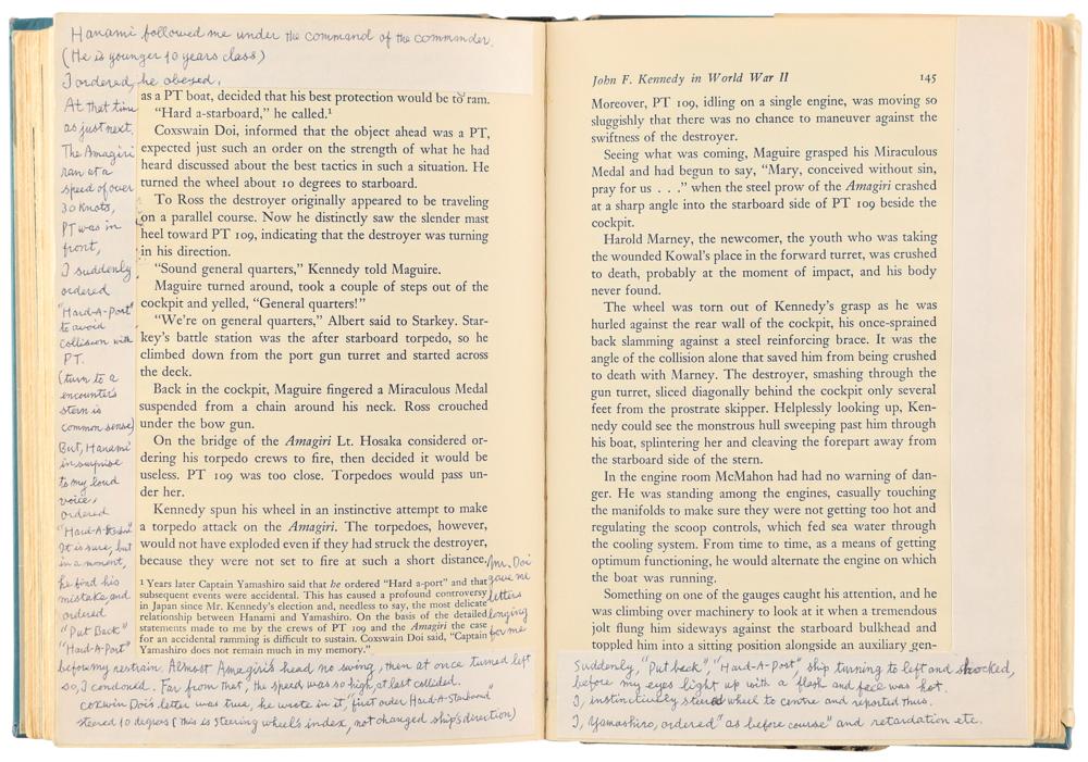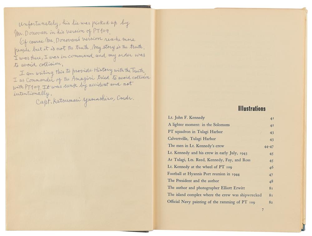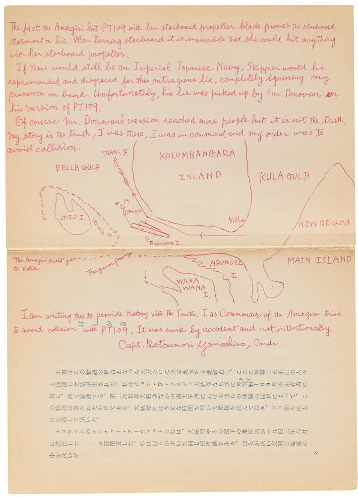 - 1961 book PT-109 by Robert J. Donovan with over 2000 words and detailed maps annotated by Capt. Katsumari Yamashiro (circa 1962) in great detail disputing many facts from this book including the collision of the PT-109 with the Amagiri.