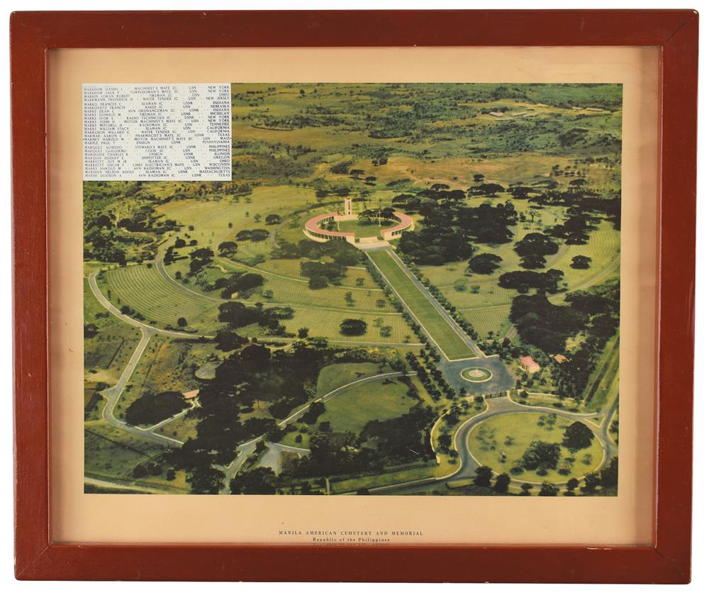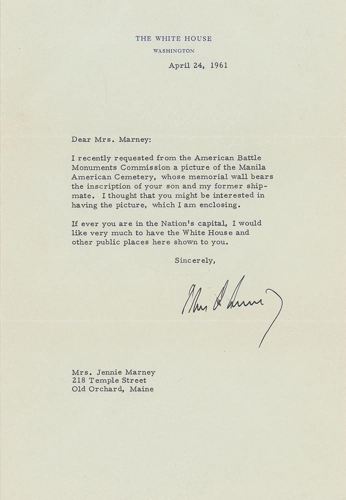 The fourth letter was typed and signed by President Kennedy on April 24, 1961 on official White House stationary, 18 years after his first letter to Mrs. Marney in 1943. President Kennedy spent the time and effort to send Mrs. Marney an original wood framed photograph of the Manila American Cemetery and Memorial along with this letter noting her son Harold’s name on this monument honoring. He writes: “I recently requested from the American Battle Monuments Commission a picture of the Manila American Cemetery, whose memorial wall bears the inscription of your son and my former shipmate. I thought that you might be interested in having the picture, which I am enclosing. If ever you are in the Nation’s capital, I would like very much to have the White House and other public places here shown to you.”