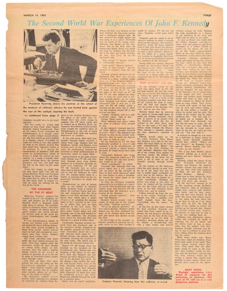As Dave Powers writes in his book “Johnny We Hardly Knew Ye” the PT-109 incident made John Kennedy a war hero that helped him in his first political contest in the 1946 Congressional Campaign. Power’s notes that Reader’s Digest reprint (the original is in this archive) of John Hersey’s article “Survival,” about Kennedy’s heroism was sent to every veteran on the voting list, and the whole district was blanketed with copies. Kennedy’s wartime heroism was highly effective when the vote of the veterans was to be a big factor. None of Kennedy’s opponents had a war record worth talking about and Kennedy’s well-known display of incredible courage in the South Pacific aboard the PT-109, gave him an aura of glamour that overshadowed his political inexperience. Though Kennedy supporters played up his War record during the primary campaign, Kennedy himself seldom mentioned it and squirmed uncomfortably when he was introduced at rallies as a war hero. In one particular speech Powers remembers Kennedy talking at length about the heroism of Patrick McMahon the 41-year old engineer of the PT-109 who was badly burned when the torpedo boat was run down and wrecked by the Amagiri. Kennedy referred to himself only once, and very briefly as McMahon’s commanding officer and never mentioned in the speech, that he himself Kennedy had saved McMahon’s life, by swimming for 5 hours with a strap on the crippled engineer’s lifebelt clenched between his teeth.