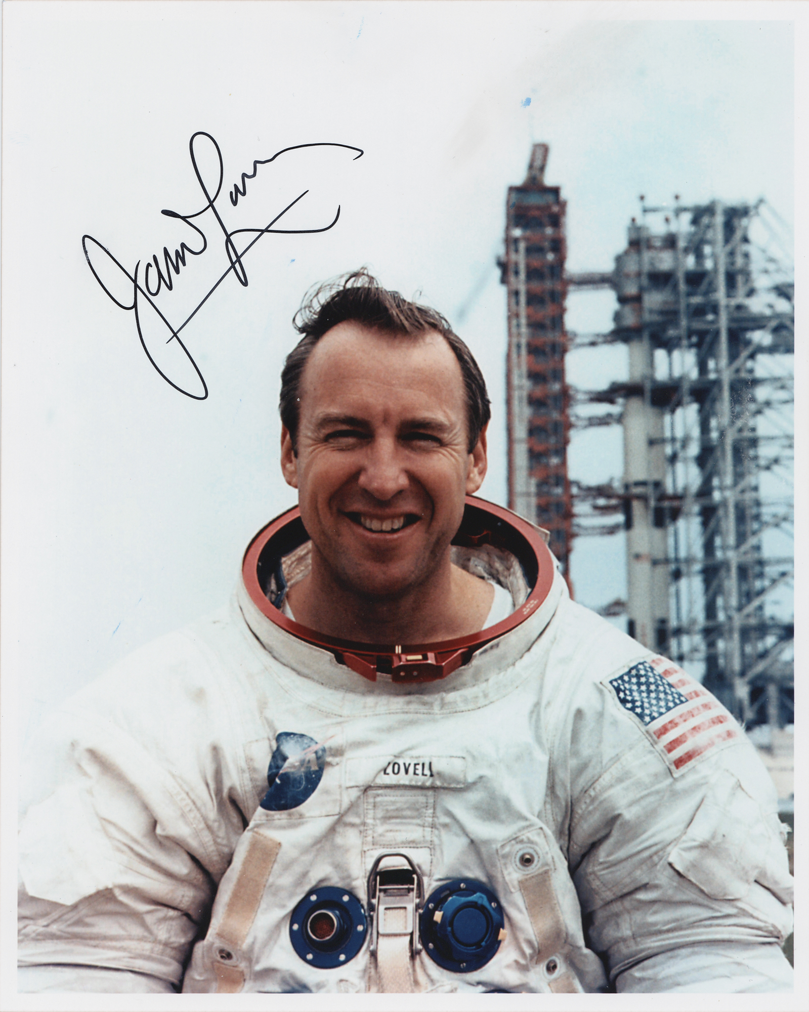 Color satin-finish 8 x 10 photo of Lovell posing in front of the launchpad in his white space suit, signed in black felt tip. In very fine condition.