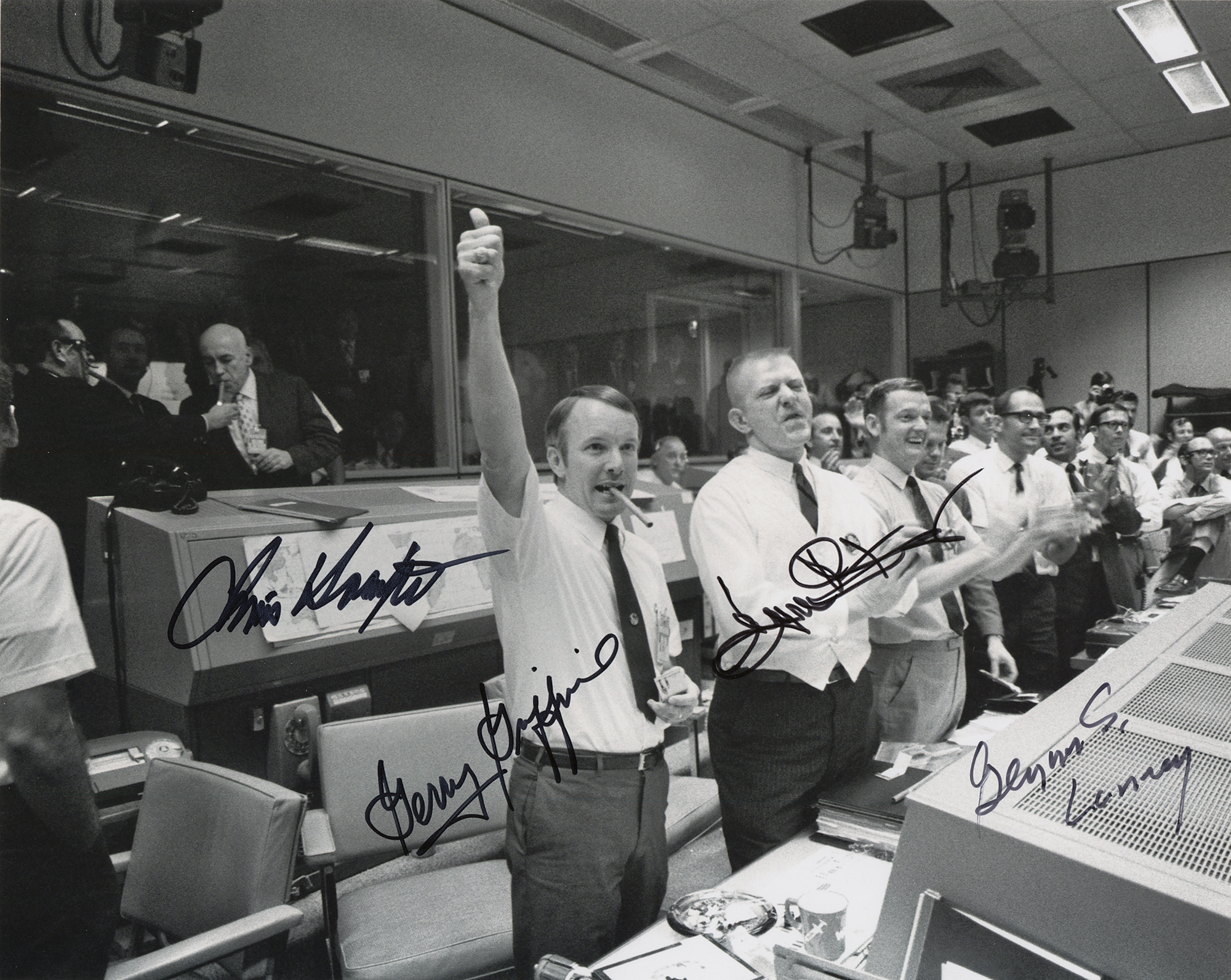 Satin-finish 10 x 8 photo of NASA Mission Control celebrating the safe splashdown of Apollo 13, signed in black felt tip by Chris Kraft, Gene Kranz, Gerry Griffin, and Glynn S. Lunney. In fine condition, with a small surface crease to the upper background area.