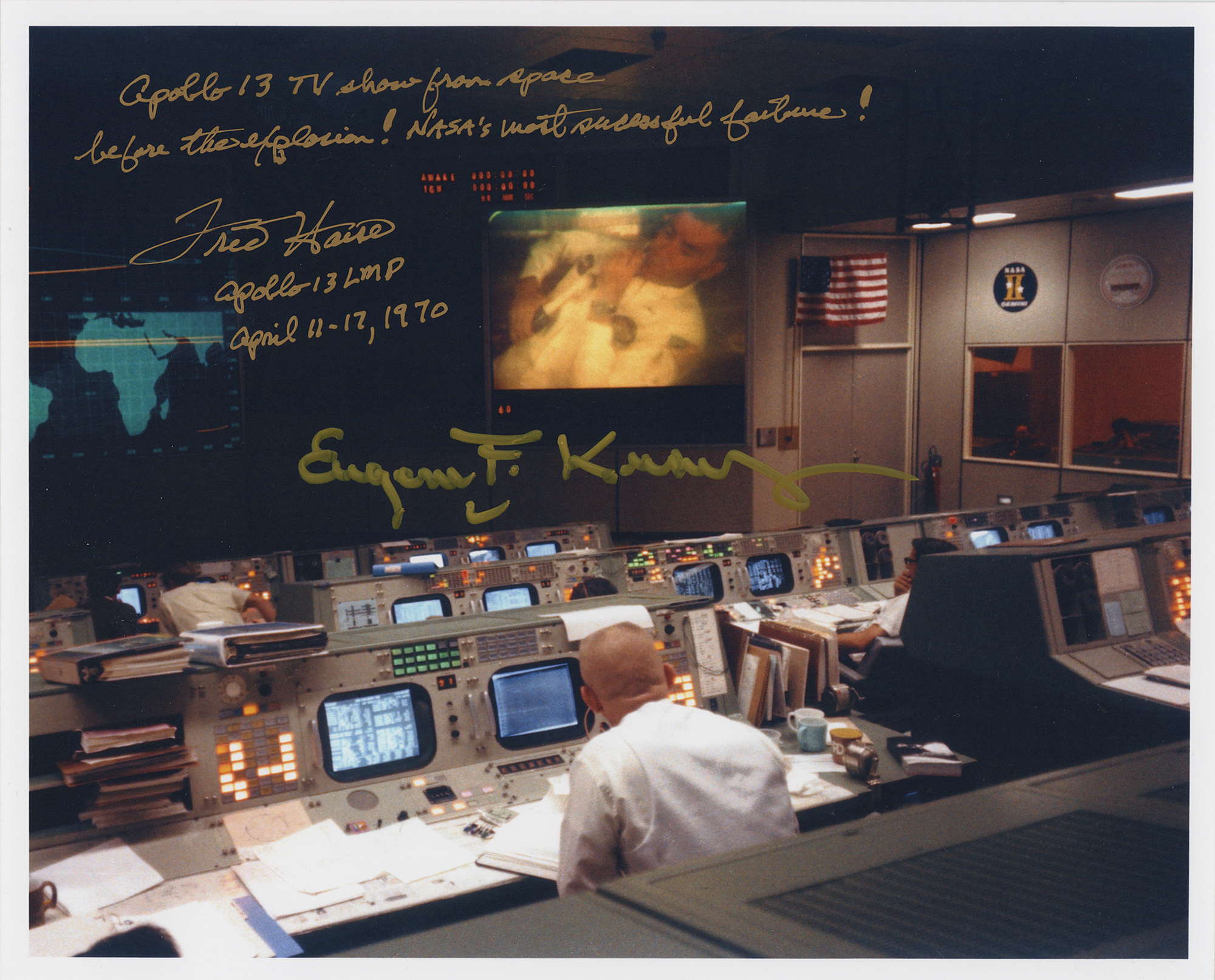 Color satin-finish 10 x 8 photo of Kranz watching an image of Fred Haise on a large screen at Mission Control, signed in gold ink, "Apollo 13 TV show from space before the explosion! NASA's most successful failure! Fred Haise, Apollo 13 LMP, April 11-17, 1970" and "Eugene F. Kranz." In fine condition.