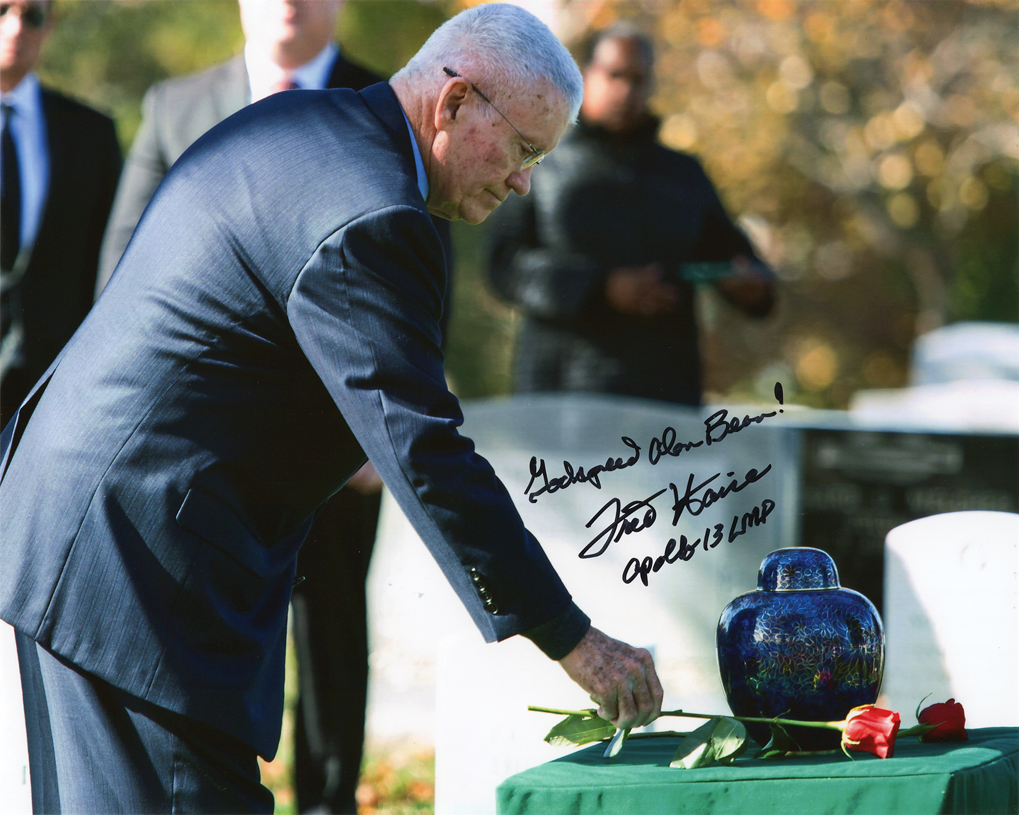 Color glossy 10 x 8 photo of Fred Haise honoring the late Alan Bean, signed in black felt tip, "Godspeed Alan Bean! Fred Haise, Apollo 13 LMP." In very fine condition.