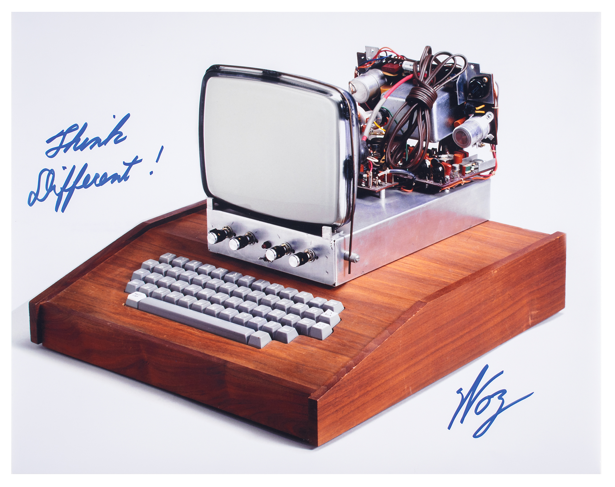 Color glossy 14 x 11 photo of the Apple-1 computer, signed in blue felt tip, "Think Different! Woz." In fine condition.