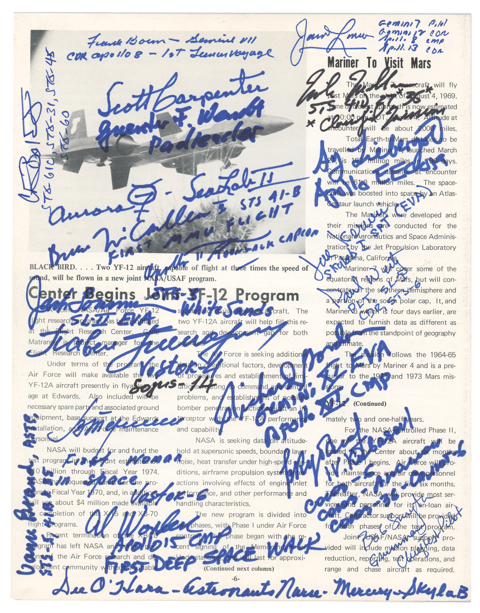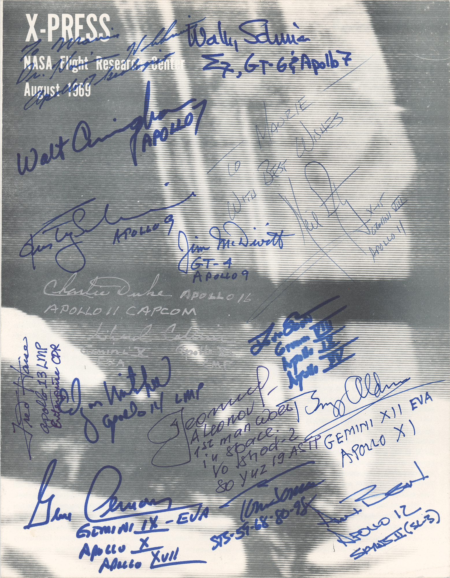 Incredible multi-signed ‘X-Press, NASA Flight Research Center' booklet from August 1969, which features an image of Neil Armstrong about to take his first step on the moon during the Apollo 11 mission. The booklet is signed on the front and back covers, and on an inner page, in multicolored ink and felt tip by 41 astronauts, cosmonauts, and various other NASA notables, including the entire Apollo 11 crew and a total of eight moonwalkers. The front cover, signed by 16, includes the following: “To Maurie—with best wishes, Neil Armstrong, X-15, Gemini VIII, Apollo 11,” “Buzz Aldrin, Gemini XII EVA, Apollo XI,” “Michael Collins, Gemini X EVA, Apollo XI CMP,” “Alan Bean, Apollo 12, Skylab II (SL-3),” “Dave Scott, Gemini VIII, Apollo IX, Apollo XV,” “Edgar Mitchell, Apollo 14 LMP,” “Charlie Duke, Apollo 16, Apollo 11 CAPCOM,” “To Maurie, Dr. Harrison H. Schmitt, Apollo 17 Geologist,” “Gene Cernan, Gemini IX-EVA, Apollo X, Apollo XVII,” “Wally Schirra, Sigma 7, GT-6 & Apollo 7,” “Walt Cunningham, Apollo 7,” “Rusty Schweickart, Apollo 9,” “Jim McDivitt, GT-4, Apollo 9,” “Alexei Leonov, 1st man walk in space, Voskhod-2, Soyuz 19 ASTP,” "Fred Haise, Apollo 13 LMP, Enterprise CDR," and “Tom Jones, STS-59-68-80-98.”