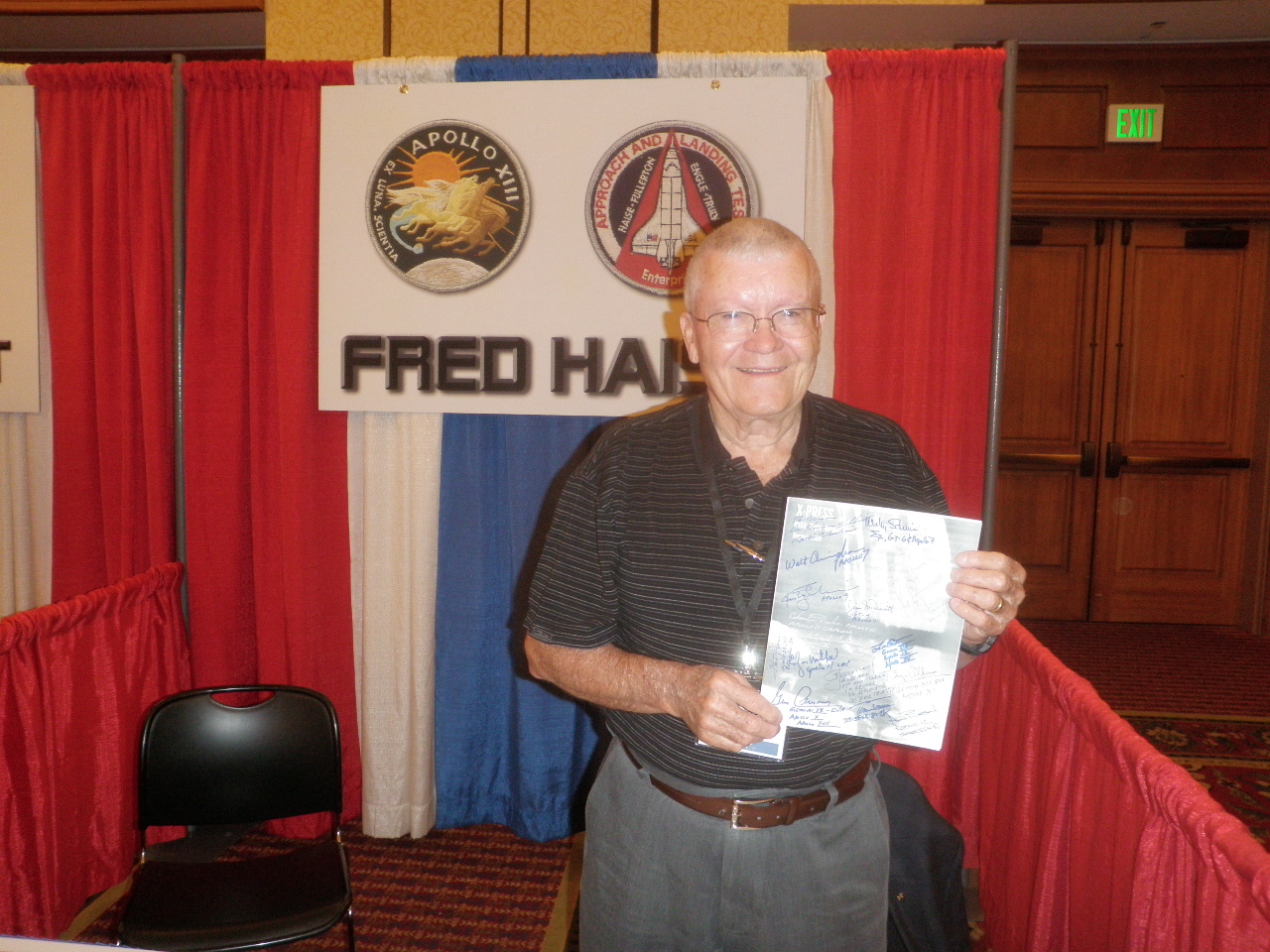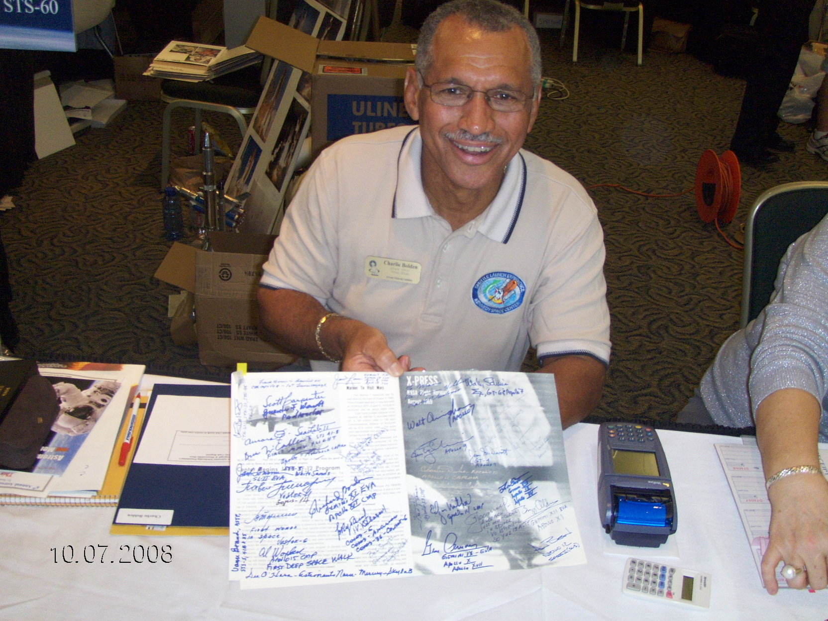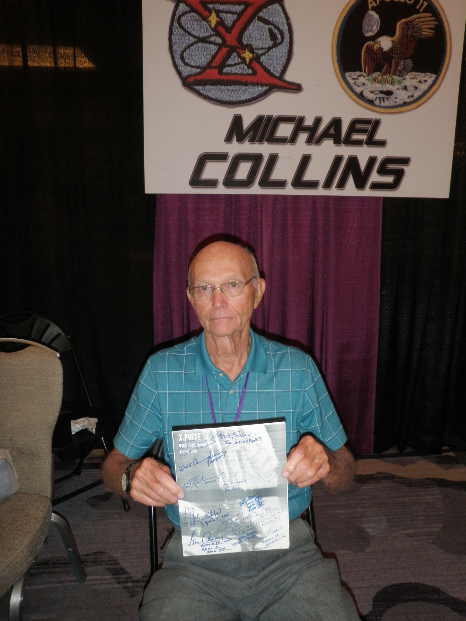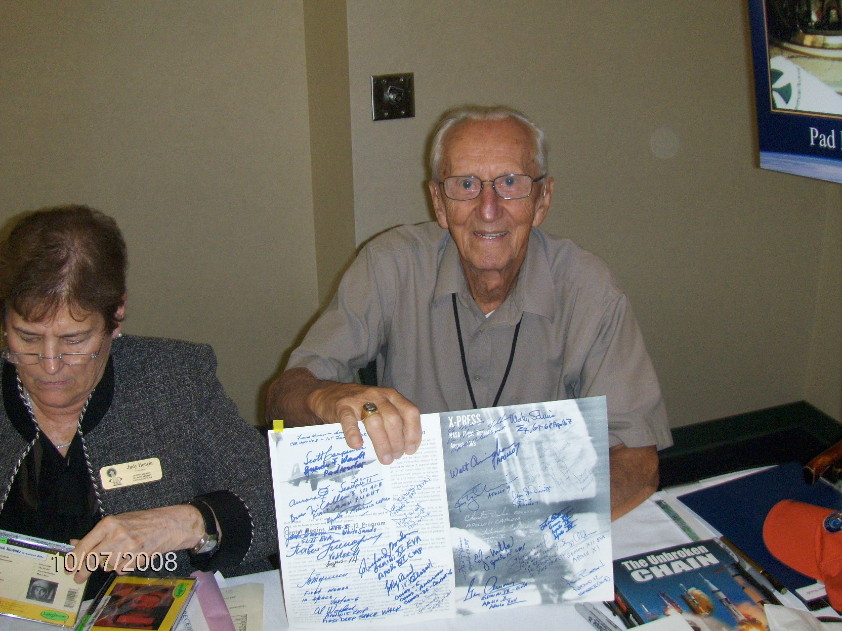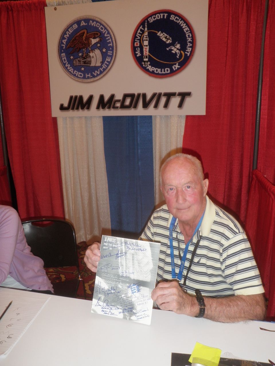 The back cover, signed by 19, is as follows: “Scott Carpenter, Aurora 7, SeaLab II,” “Guenter F. Wendt, Pad leader,” “Frank Borman, Gemini VII, CDR Apollo 8—1st lunar voyage,” “James Lovell, Gemini 7 Pilot, Gemini 12 CDR, Apollo 8 CMP, Apollo 13 CDR,” “Richard Gordon, Gemini XI EVA, Apollo XII CMP,” “Al Worden, Apollo 15 CMP, First deep space walk,” “Vance Brand, ASTP, STS-5, 41B & 35,” “Jack Lousma, SL-II EVA, STS-3 White Sands,” “Bruce McCandless II, STS 41-B, First MMU flight, Apollo 11 moonwalk CAPCOM,” “Joe Kerwin, Skylab I SPT (EVA),” “Paul Weitz, PLT, SL-I, CDR, STS-6,” “Sy Liebergot, Apollo EECOM,” “Charles F. Bolden, STS-61C, STS-31, STS-45, STS-60,” “Pavel Popovich, Vostok-4, Soyuz-14,” “Valentina Tereshkova, First woman in space, Vostok-6,” “Valery Kubasov,” “Bob Smyth, Grumman Chief Test Pilot,” “Mike Mullane, STS 41D, 27, 36, Classified Mission,” and “Dee O’Hara—Astronaut Nurse, Mercury, Skylab.”