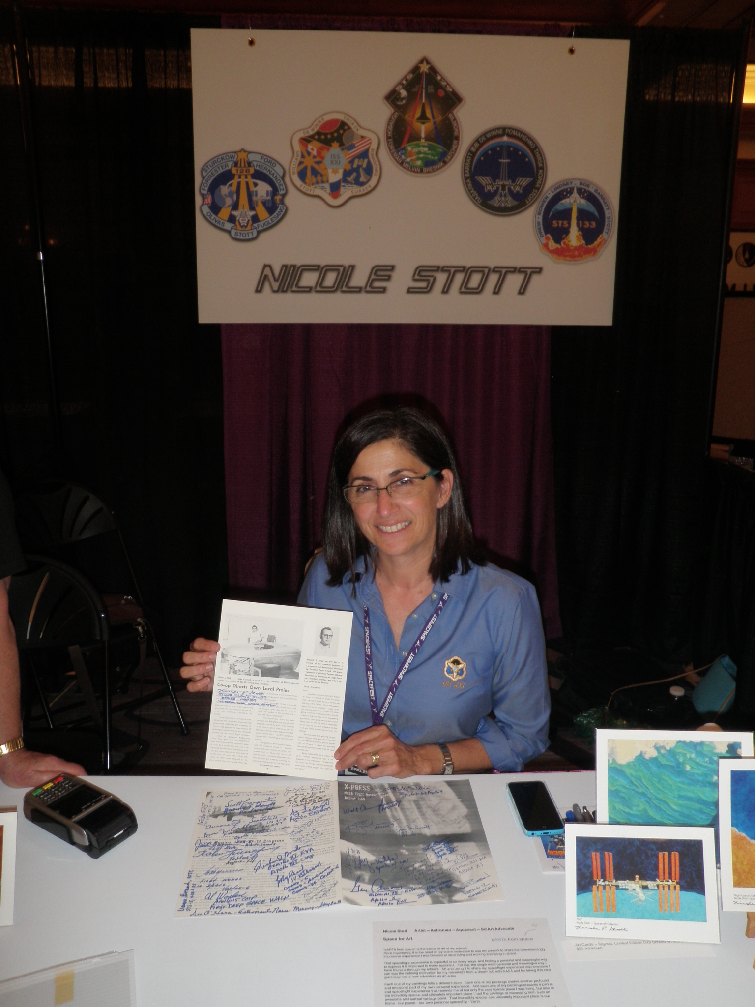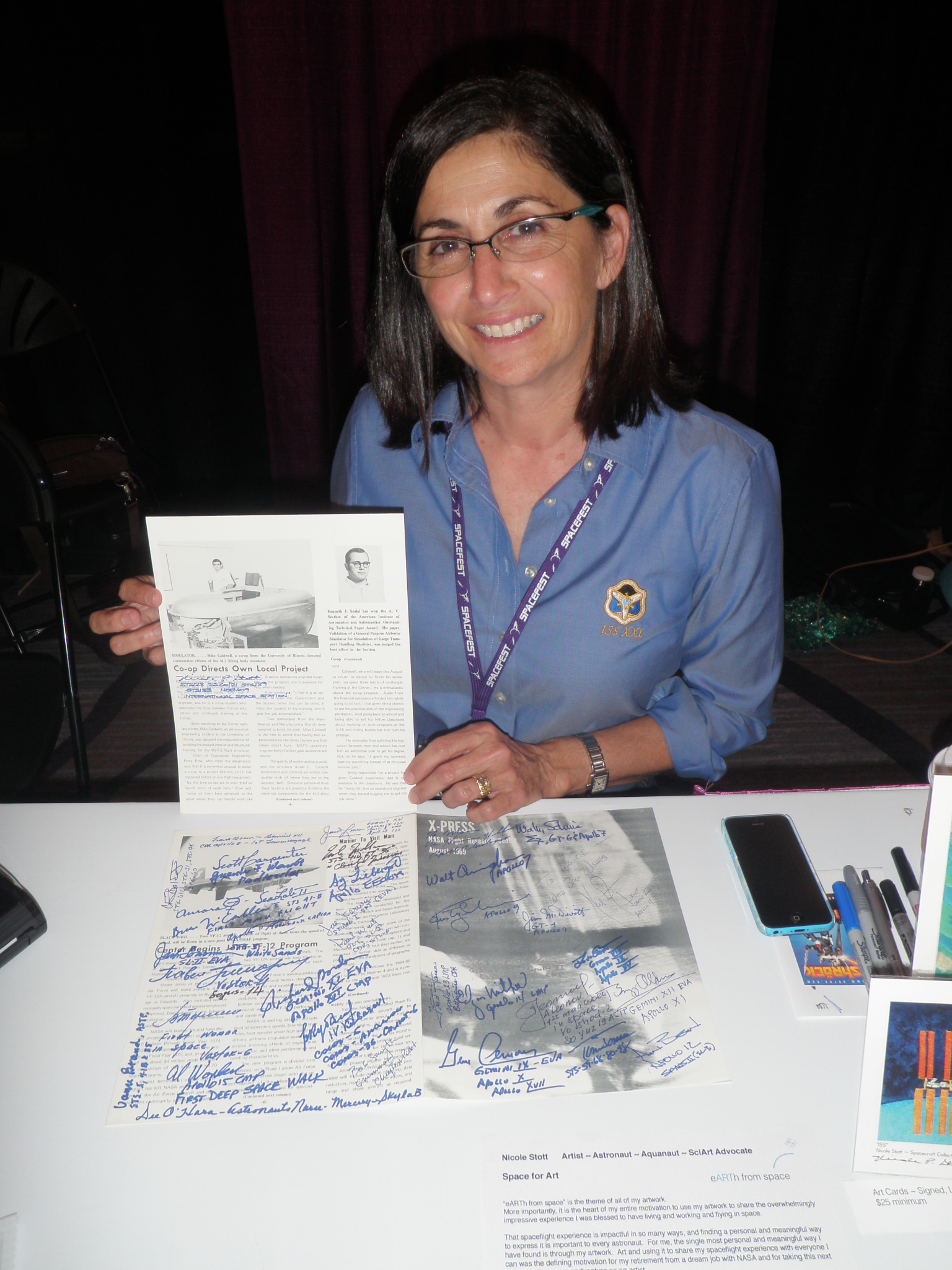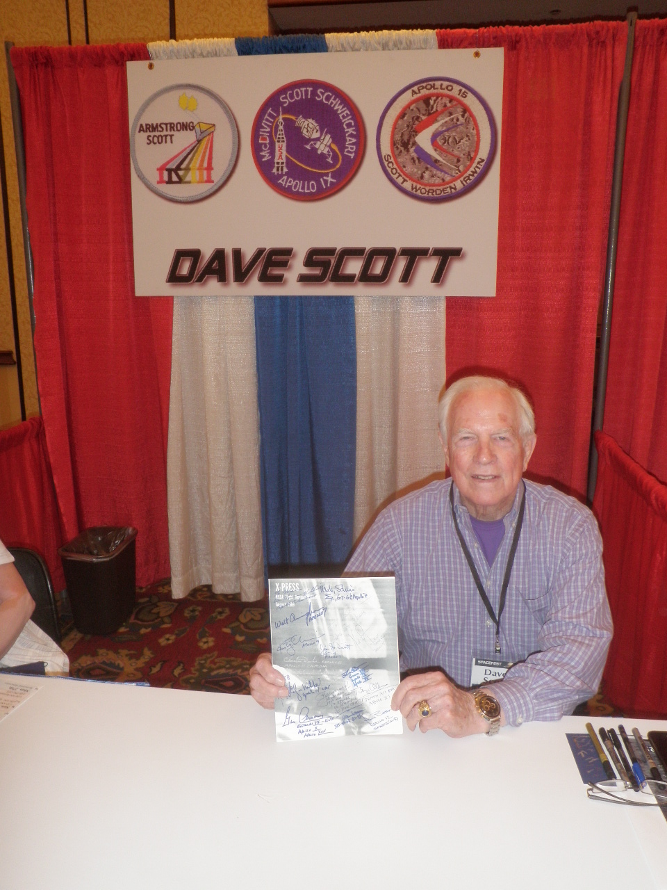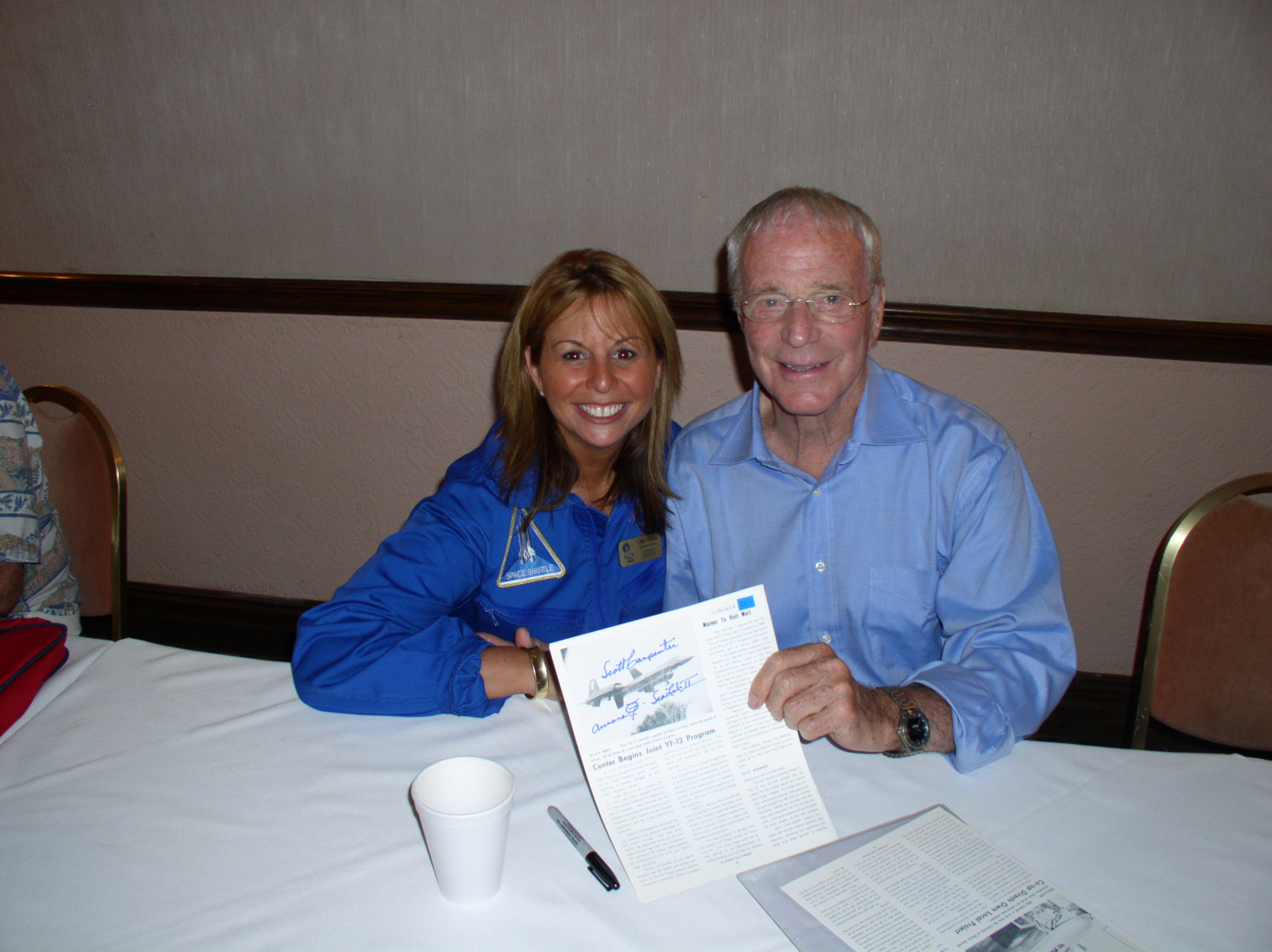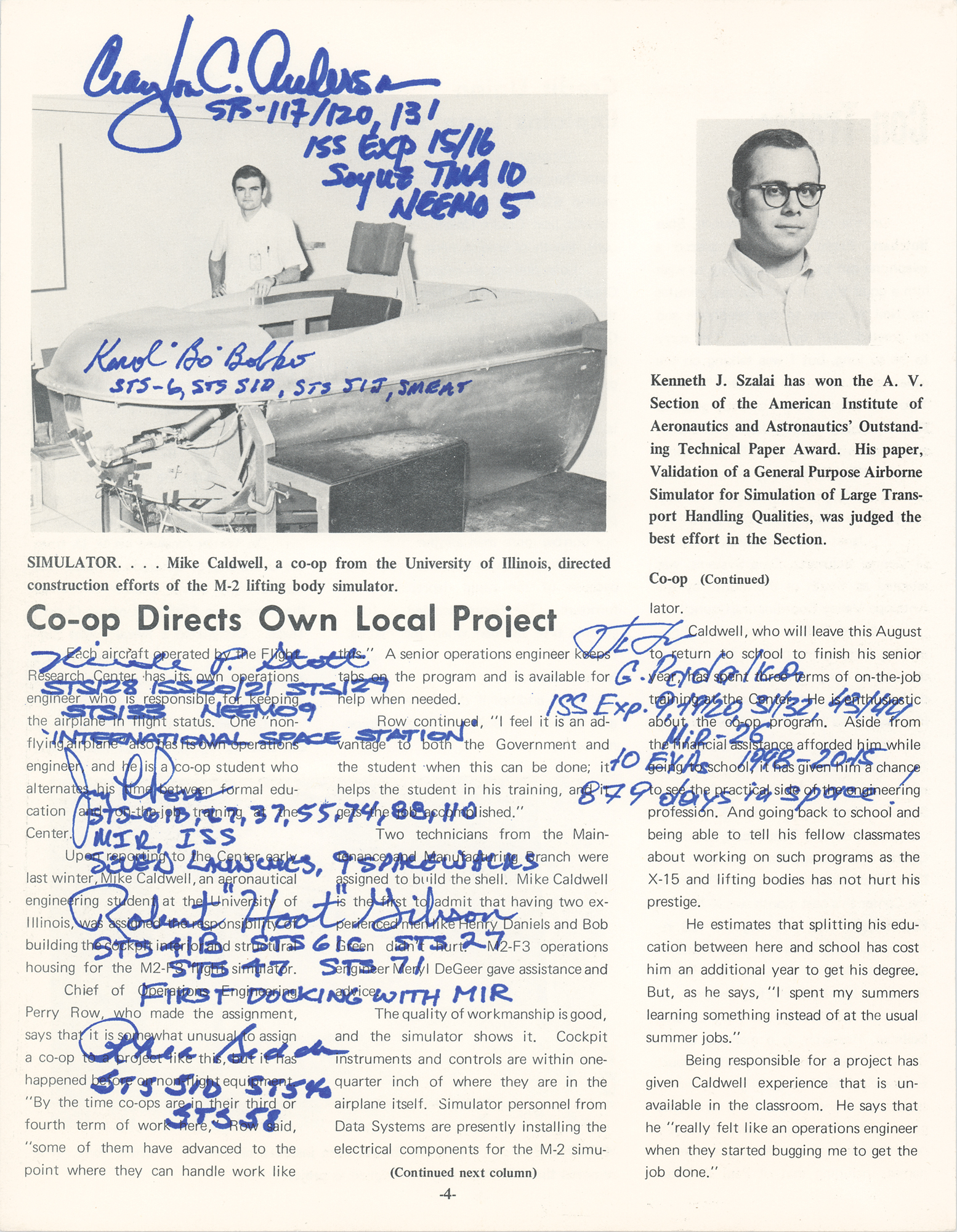 The back cover, signed by 19, is as follows: “Scott Carpenter, Aurora 7, SeaLab II,” “Guenter F. Wendt, Pad leader,” “Frank Borman, Gemini VII, CDR Apollo 8—1st lunar voyage,” “James Lovell, Gemini 7 Pilot, Gemini 12 CDR, Apollo 8 CMP, Apollo 13 CDR,” “Richard Gordon, Gemini XI EVA, Apollo XII CMP,” “Al Worden, Apollo 15 CMP, First deep space walk,” “Vance Brand, ASTP, STS-5, 41B & 35,” “Jack Lousma, SL-II EVA, STS-3 White Sands,” “Bruce McCandless II, STS 41-B, First MMU flight, Apollo 11 moonwalk CAPCOM,” “Joe Kerwin, Skylab I SPT (EVA),” “Paul Weitz, PLT, SL-I, CDR, STS-6,” “Sy Liebergot, Apollo EECOM,” “Charles F. Bolden, STS-61C, STS-31, STS-45, STS-60,” “Pavel Popovich, Vostok-4, Soyuz-14,” “Valentina Tereshkova, First woman in space, Vostok-6,” “Valery Kubasov,” “Bob Smyth, Grumman Chief Test Pilot,” “Mike Mullane, STS 41D, 27, 36, Classified Mission,” and “Dee O’Hara—Astronaut Nurse, Mercury, Skylab.”
