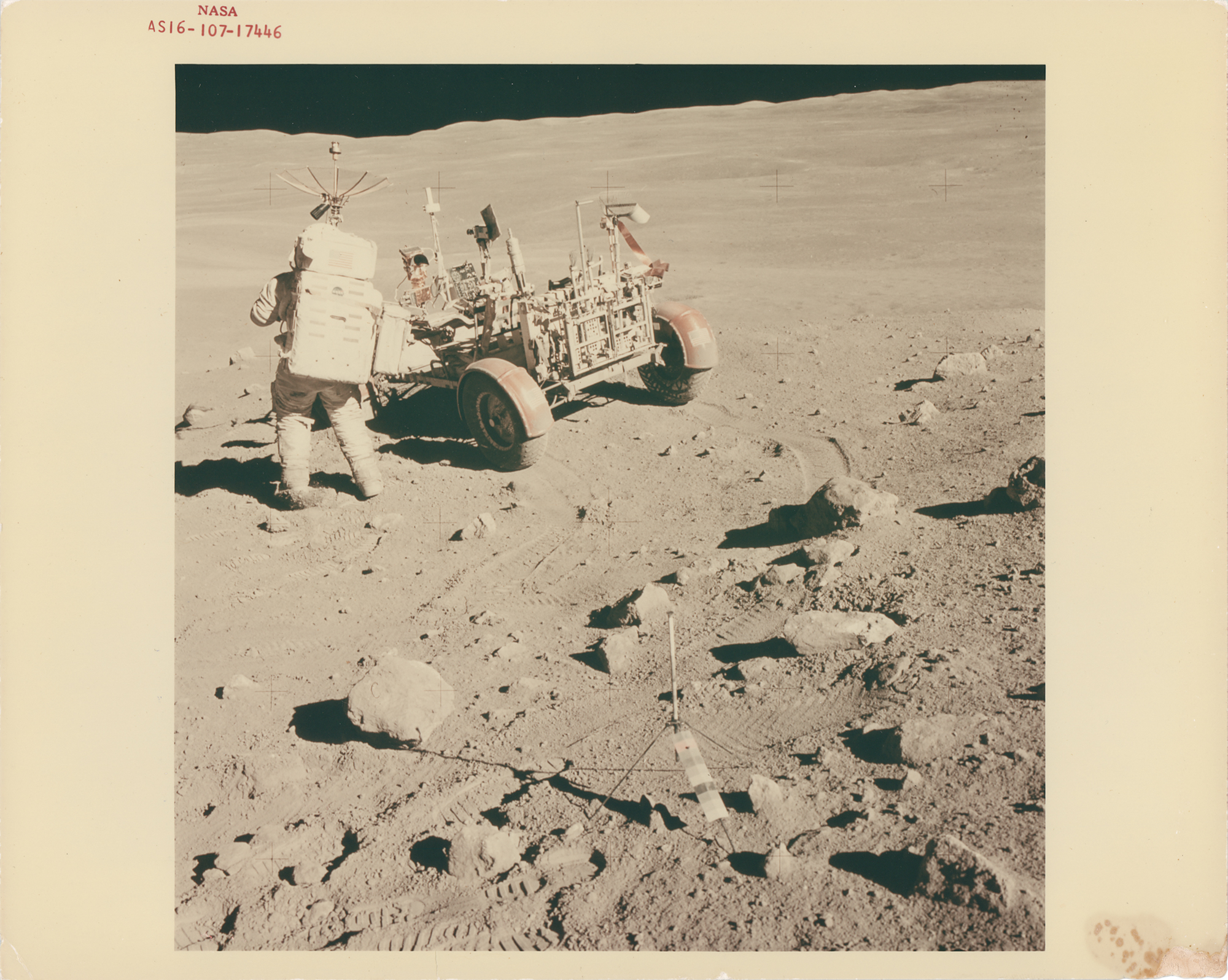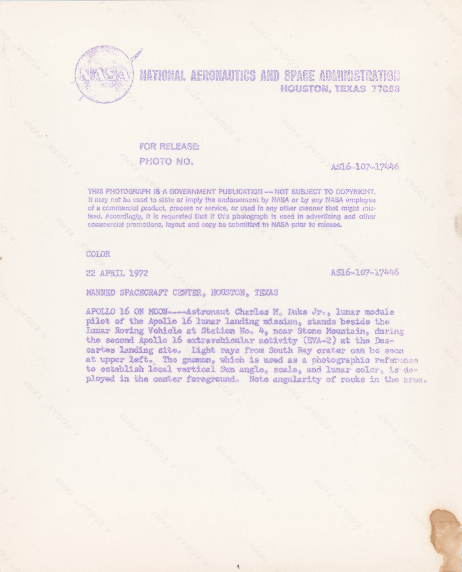 Original vintage color glossy 10 x 8 red-numbered (AS16-107-17446) NASA photo of LMP Charlie Duke standing next to the Lunar Roving Vehicle at Station No.4, near Stone Mountain, during the second Apollo 16 EVA at the Descartes Landing site. The gnomon is pictured in the foreground. Reverse of photo bears “A Kodak Paper” watermarks and purple NASA caption text. In fine condition, with small stains and emulsion loss to lower right corner.