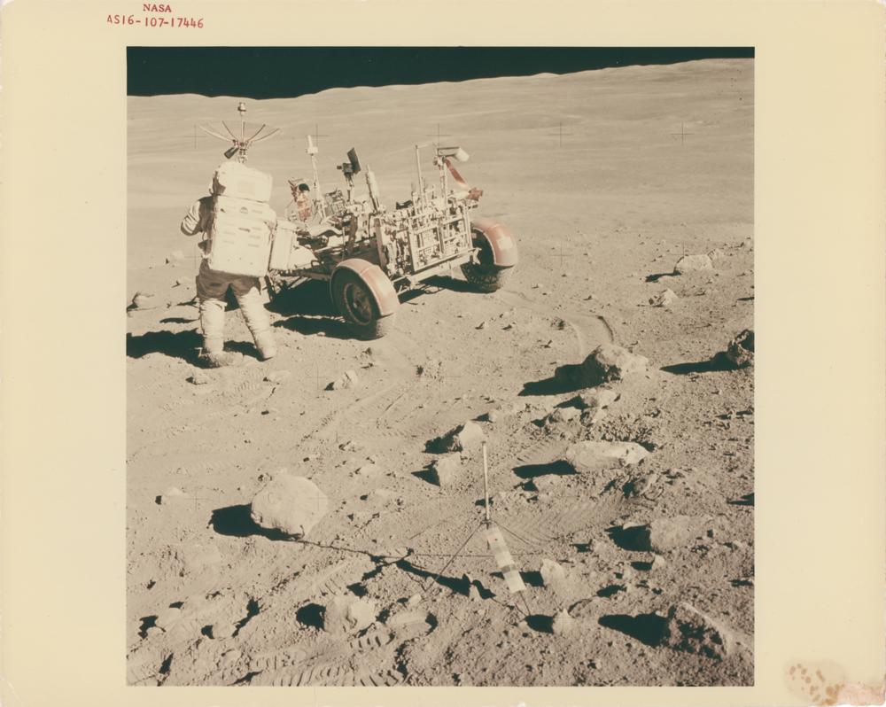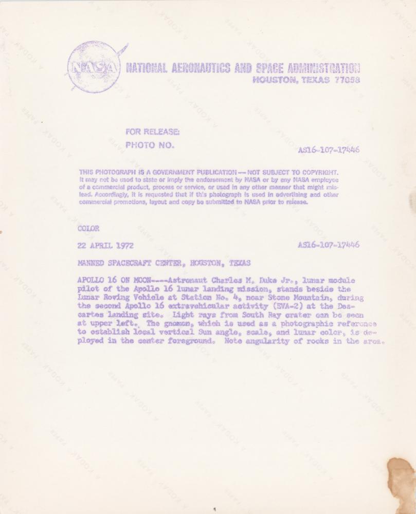 Original vintage color glossy 10 x 8 red-numbered (AS16-107-17446) NASA photo of LMP Charlie Duke standing next to the Lunar Roving Vehicle at Station No.4, near Stone Mountain, during the second Apollo 16 EVA at the Descartes Landing site. The gnomon is pictured in the foreground. Reverse of photo bears "A Kodak Paper" watermarks and purple NASA caption text. In fine condition, with small stains and emulsion loss to lower right corner.