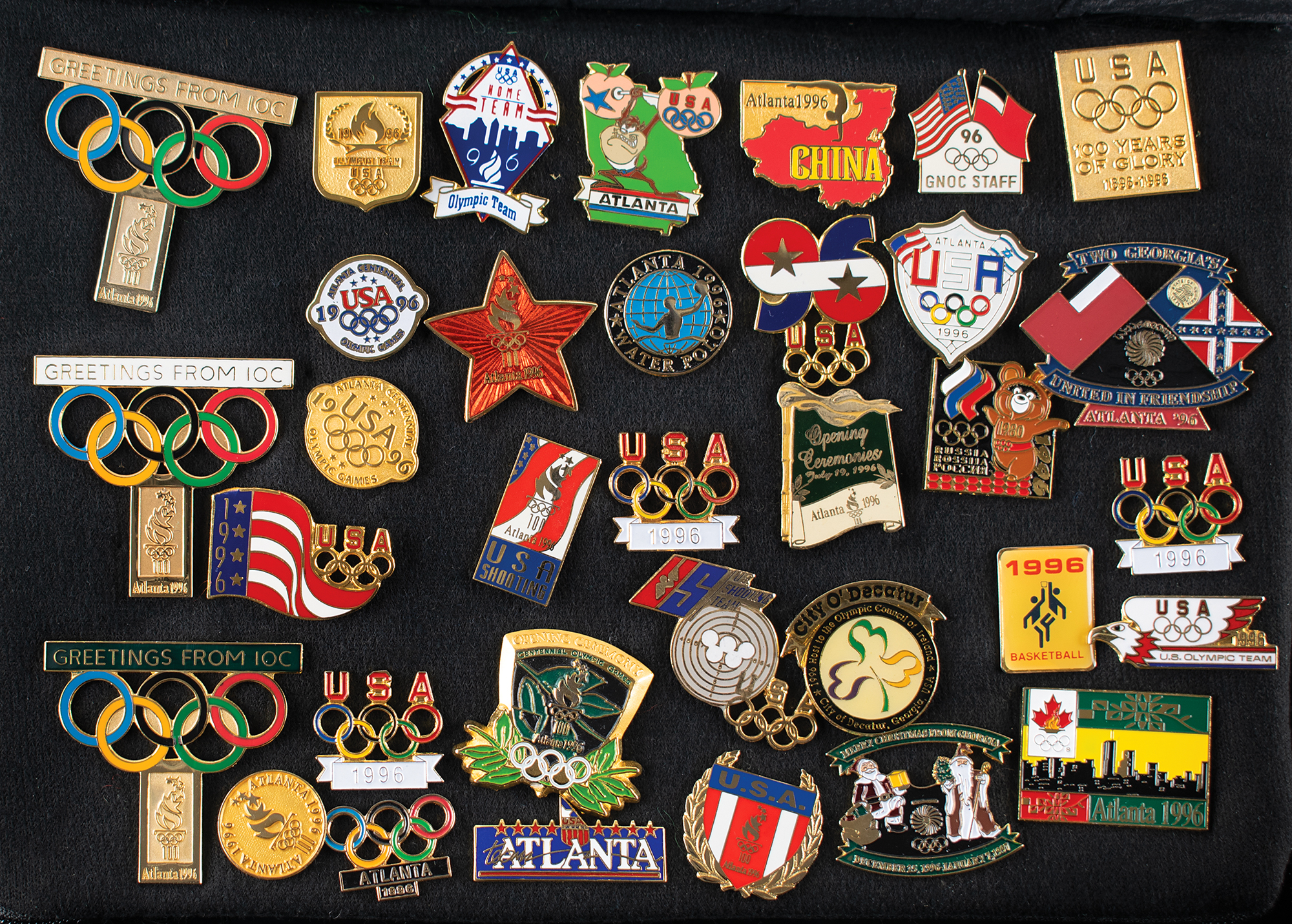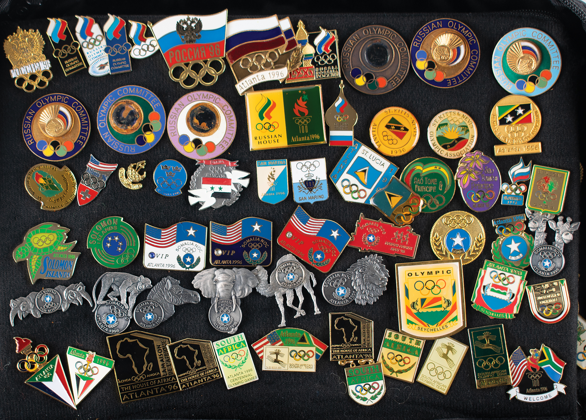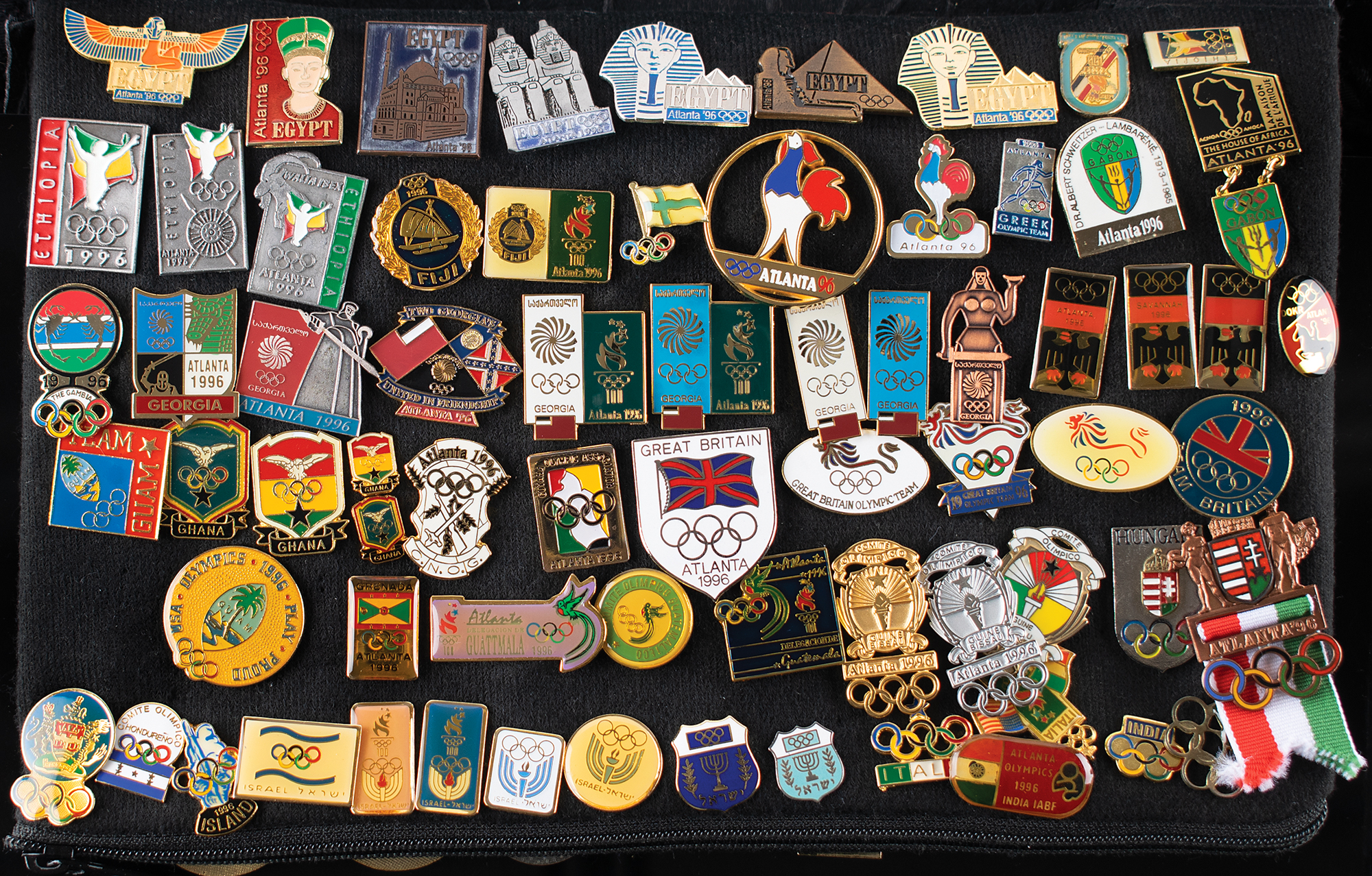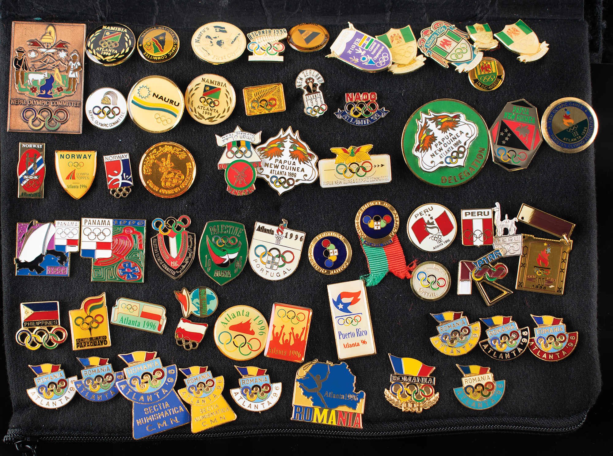 Massive collection of nearly 600 pins issued for the Atlanta 1996 Summer Olympics, ranging in size from 13 mm x 13 mm to 76 mm in diameter, the majority of which are NOC pins, includes some duplicates. The pins are displayed on separate sheets inside a zippered carrying bag. In overall fine condition. An impressive and exhaustive array of hard-to-find pins from the Centennial Olympic Games.