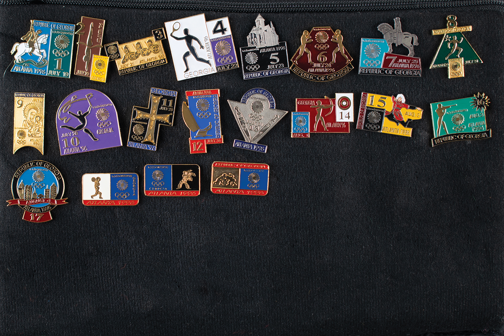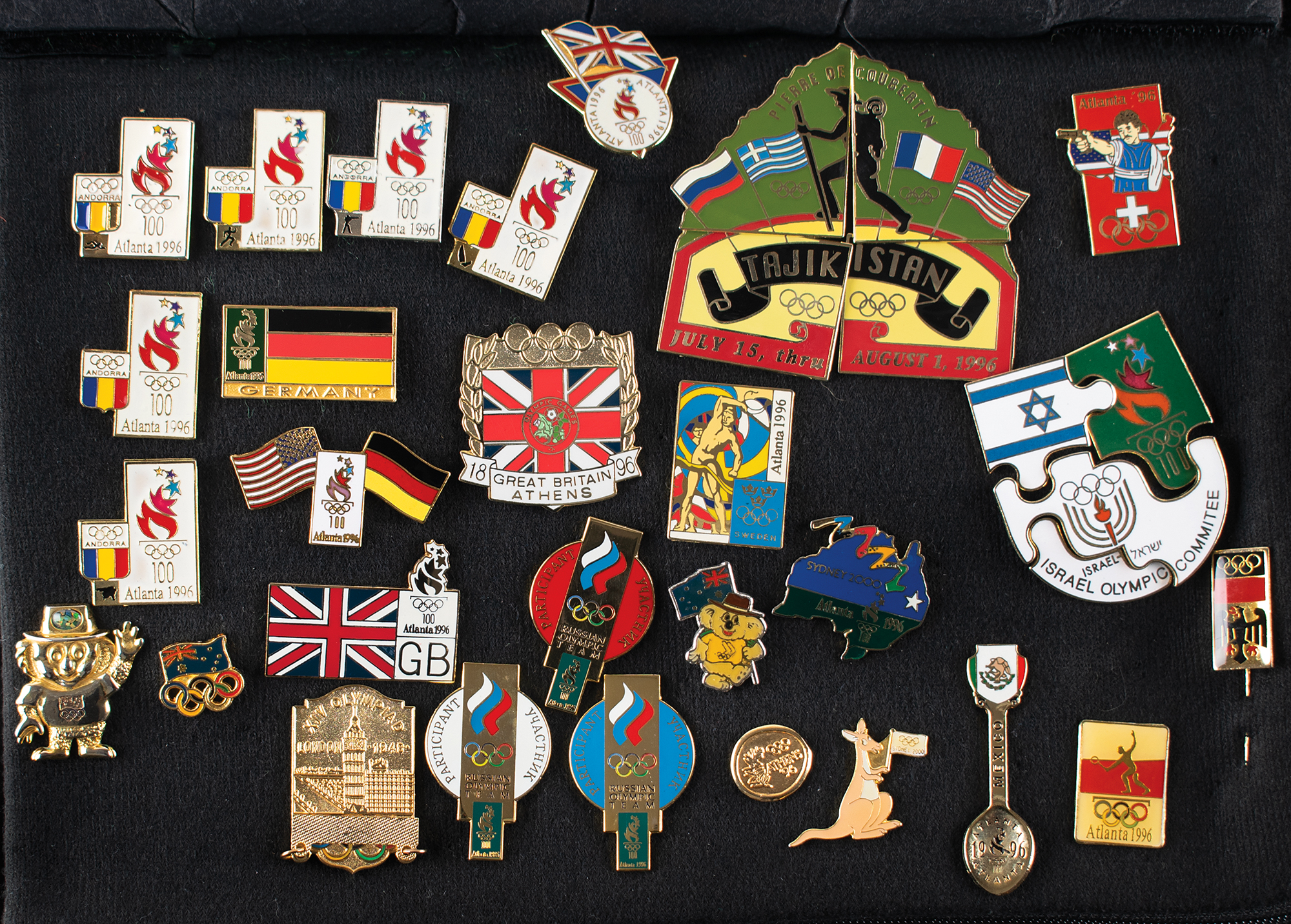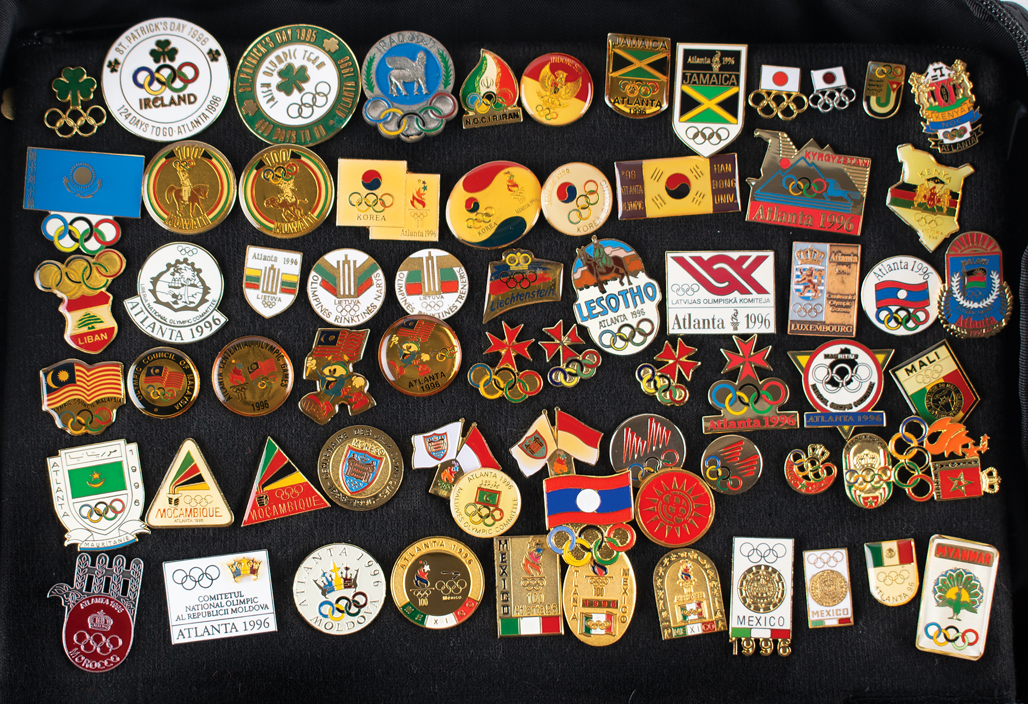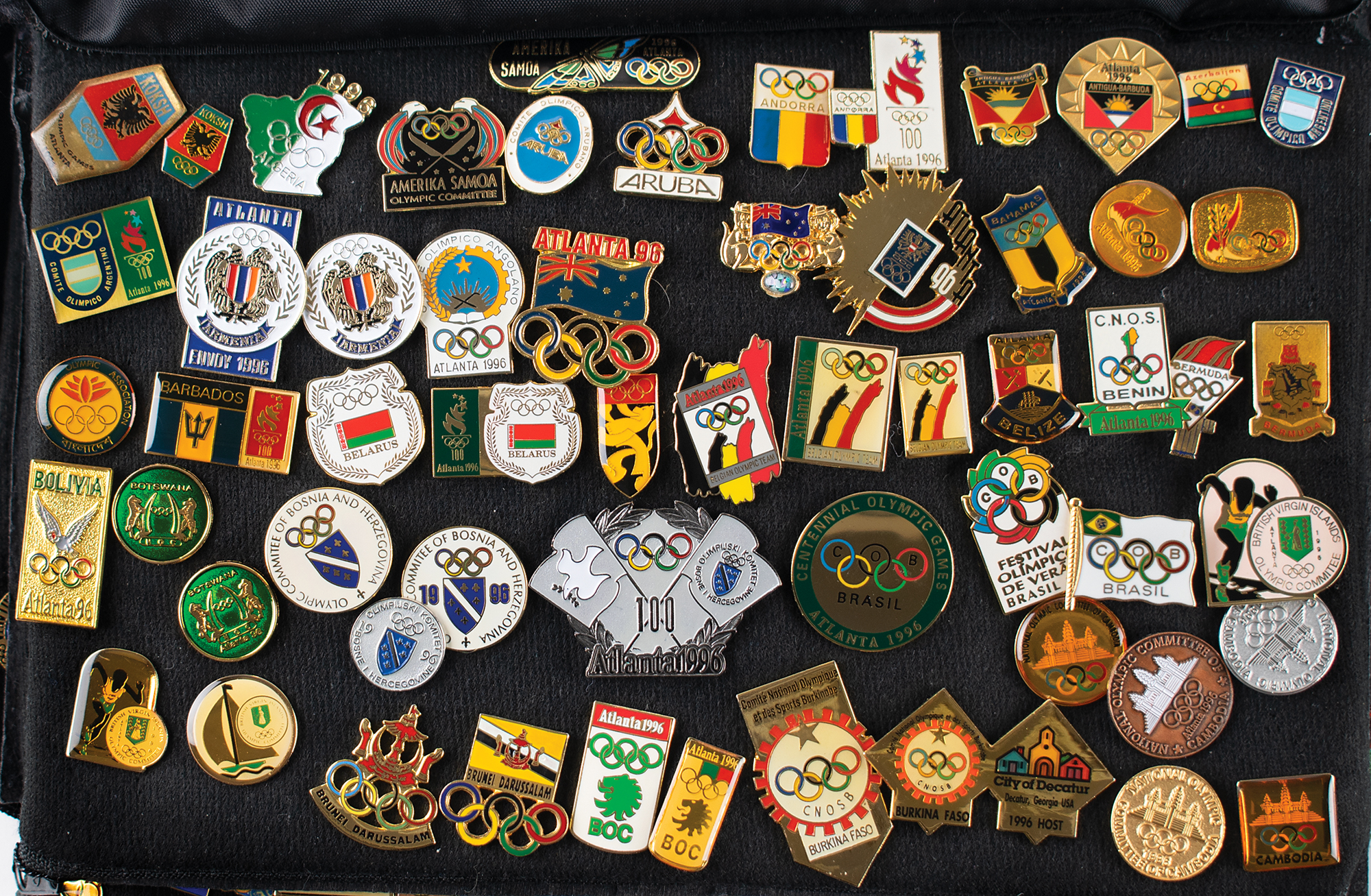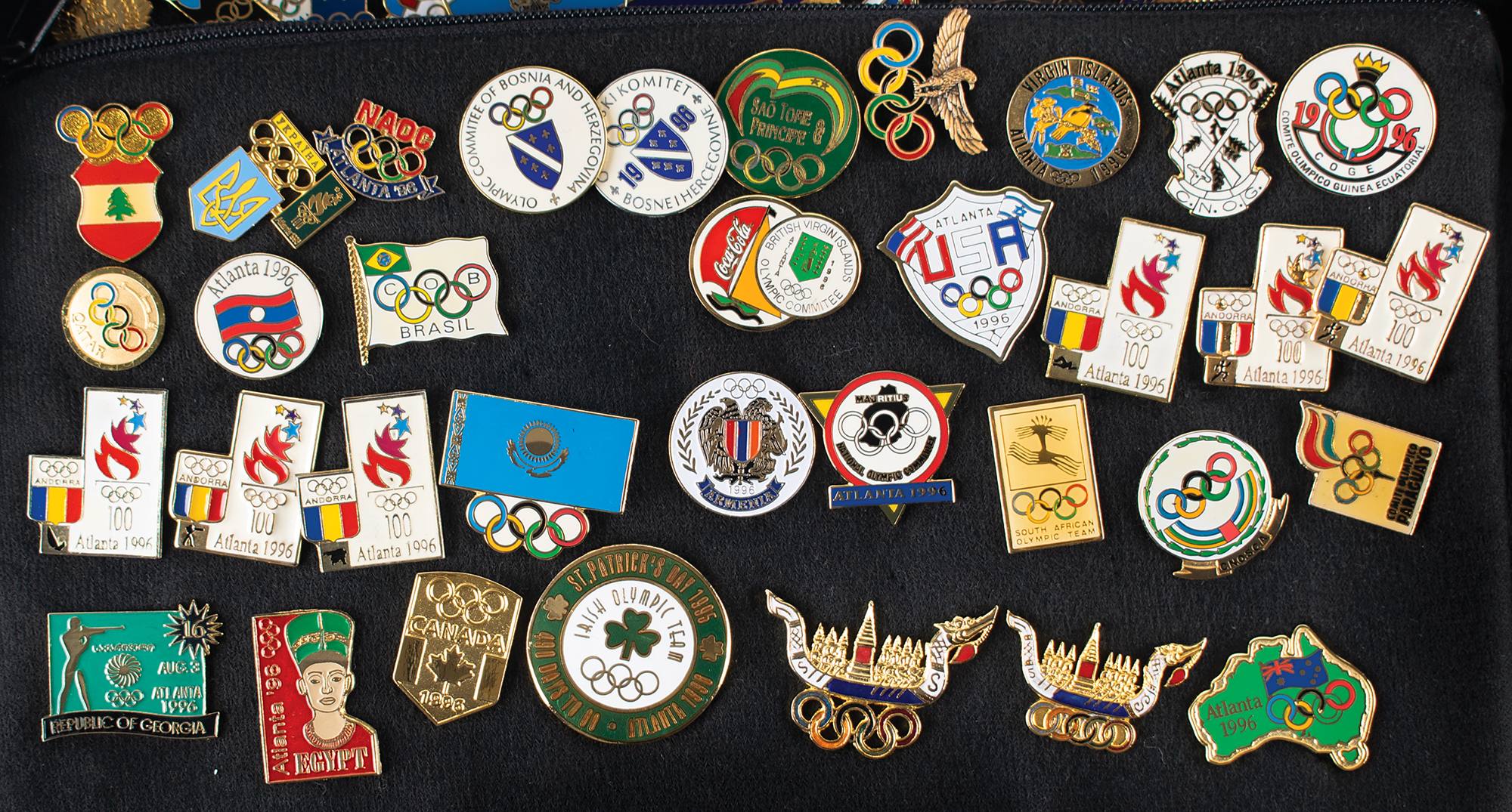 Massive collection of nearly 600 pins issued for the Atlanta 1996 Summer Olympics, ranging in size from 13 mm x 13 mm to 76 mm in diameter, the majority of which are NOC pins, includes some duplicates. The pins are displayed on separate sheets inside a zippered carrying bag. In overall fine condition. An impressive and exhaustive array of hard-to-find pins from the Centennial Olympic Games.