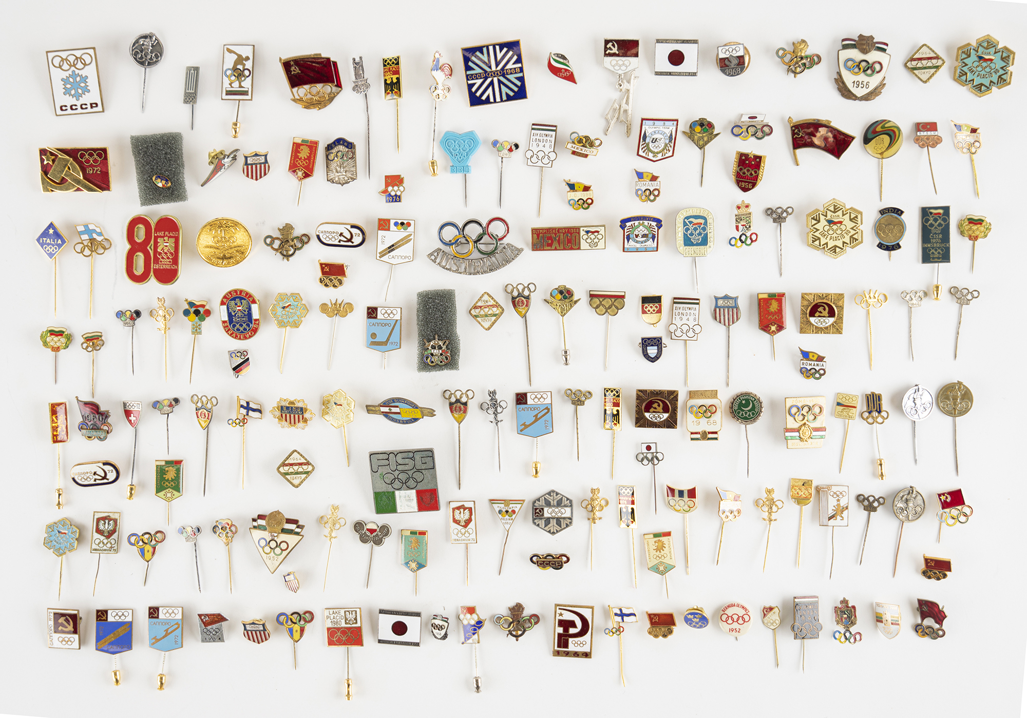 Collection of over 150 NOC and Federation pins from past Summer and Winter Olympics, ranging in size from 6 mm x 6 mm to 38 mm x 38 mm, which includes pins from countries like Bermuda, England, Finland, Germany, Hungary, India, Italy, Japan, Liechtenstein, Mexico, Pakistan, Poland, Romania, Saudi Arabia, Soviet Union, United States, and more. In overall fine condition, with some wear to backs or enamel.