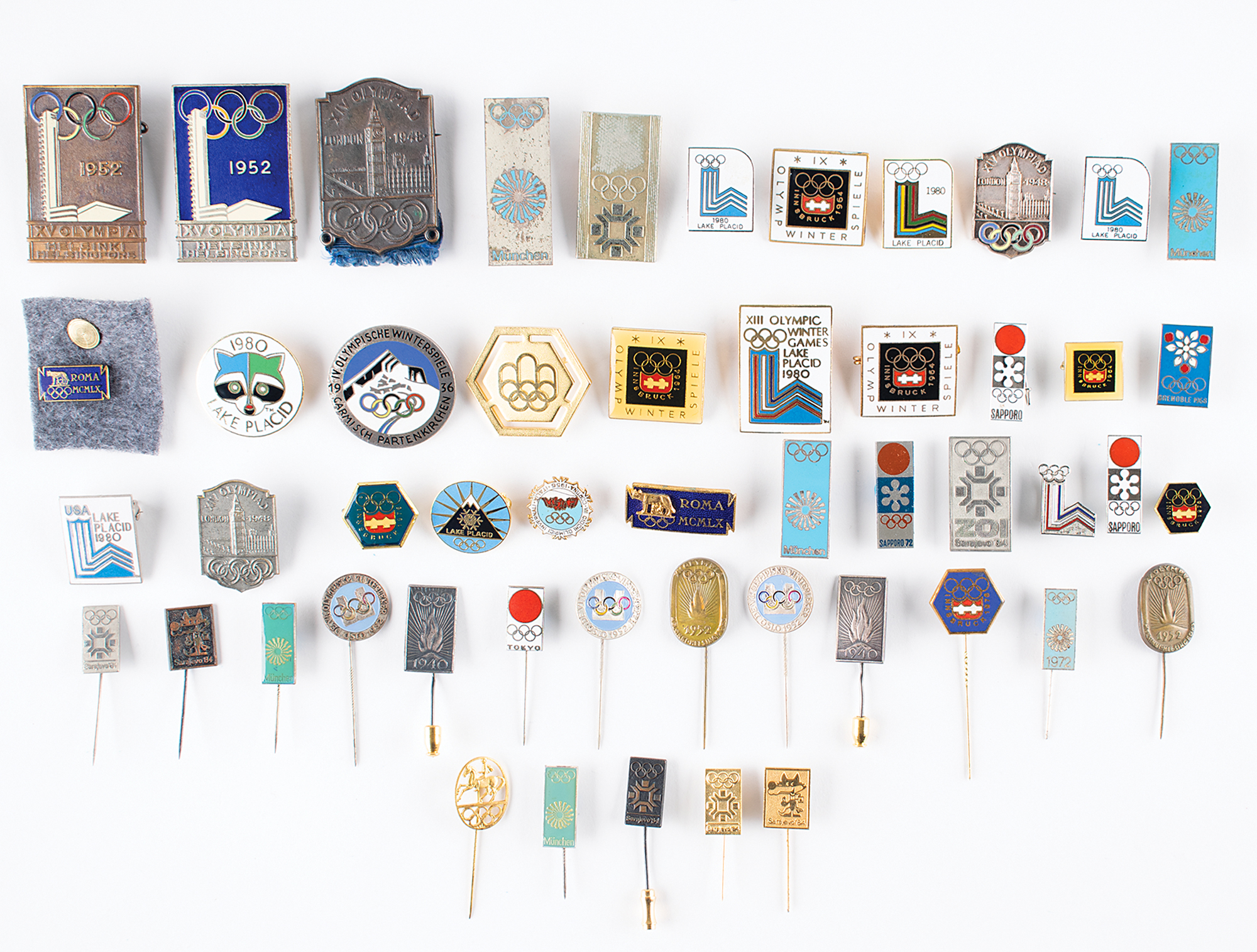Collection of over 50 primary pins from past Summer and Winter Olympics, ranging in size from 13 mm x 13 mm to 32 mm x 51 mm, which includes the following Olympic Games: Garmisch (1936), Helsinki (1940), London (1948), Helsinki (1952), Oslo (1952), Stockholm (1956), Cortina (1956), Rome (1960), Innsbruck (1964), Tokyo (1964), Grenoble (1968), Munich (1972), Sapporo (1972), Lake Placid (1980), and Sarajevo (1984). In overall fine condition.