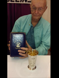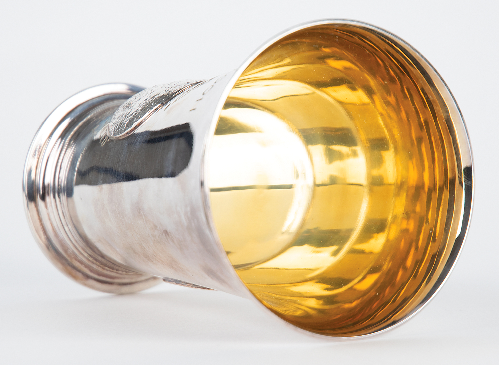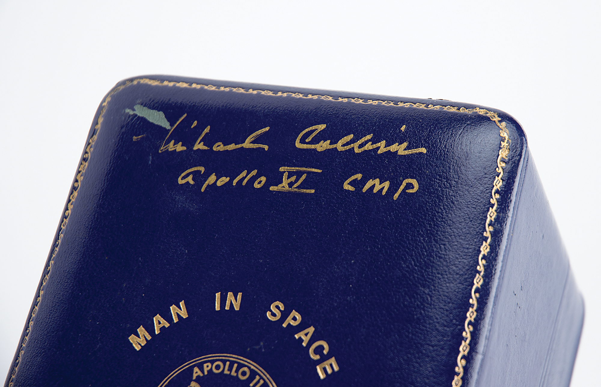 Limited edition sterling silver beaker honoring the Apollo 11 mission. Numbered 69/1500, made by Prestons Limited, 9.1 troy oz., 5.25″ tall and a 3.25″ mouth, with one side featuring an embossed moon, an engraved lunar module, and text: “Man on the Moon, The Eagle Has Landed, 20th July 1969”; and the opposite featuring an engraved NASA ‘meatball’ logo, a raised Apollo 11 mission insignia, and the astronauts’ name. Includes the original blue leather presentation case, 5.25 x 8.25 x 4.75, which is signed on the top in gold ink, “Michael Collins, Apollo XI CMP.” In fine condition, with some scuffing to beaker, and a scratch to case near but not affecting the autograph.