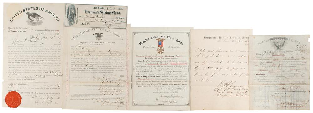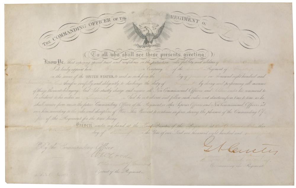Extremely rare and highly sought-after partly-printed vellum DS, signed "G. A. Custer," one page, 15.5 x 9.75, February 11, 1875. Custer, as Lieutenant Colonel of the Cavalry, appoints "Charles Smith?a Sergeant in Company E of the Seventh Regiment of Cavalry in the service of the United States." Robustly signed at the bottom by Custer and countersigned by commanding officer W. W. Cooke. In fine condition, with a few small stains, and the handwritten portions of the body of the document light but legible. The appointee, Charles F. Smith, was born in 1848 in Germany and enlisted in the United States Army on March 3, 1871, for a term of five years; fortunately, this term expired and he was discharged just three months before the Battle of the Little Bighorn and 'Custer's Last Stand,' in which his company was annihilated. Smith then reenlisted in 1881 for another period of five years. The Custer appointment is accompanied by a small archive related to Smith's career, including the discharge from the end of his first term of service; his subsequent oath of reenlistment and allegiance; a letter of recommendation; his membership certificate in the Regular Army and Navy Union; a certificate of deposit issued by Boatmen's Saving Bank in St. Louis; and a document granting him citizenship in the United States.