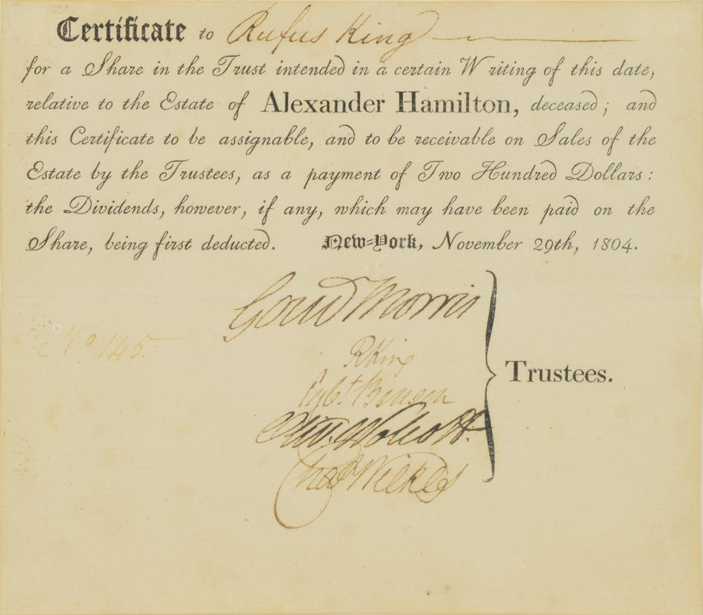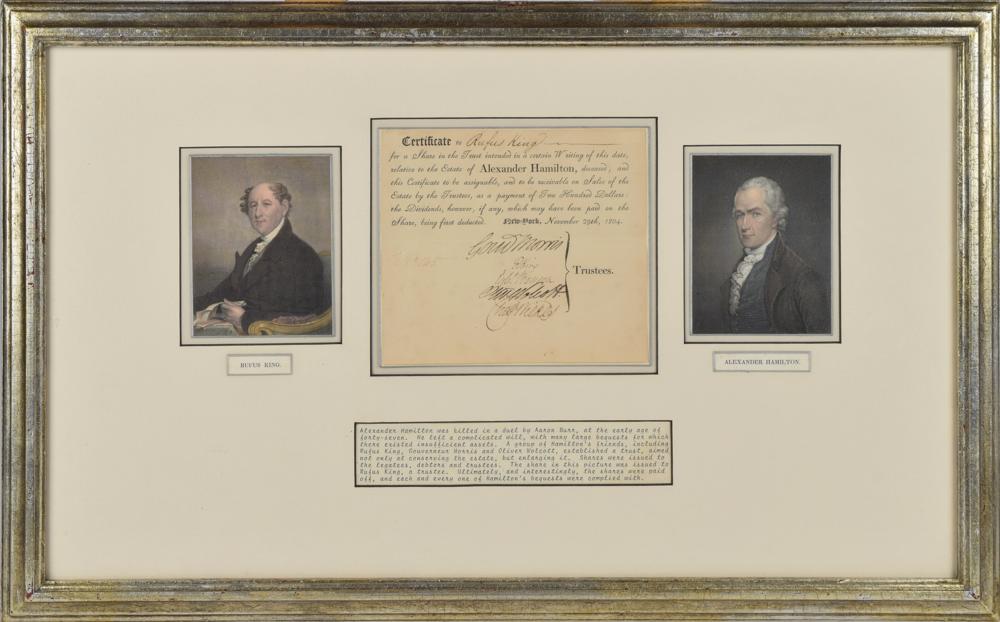 Significant partly-printed document concerning the estate of Alexander Hamilton, one page, 6.5 x 5.75, November 29, 1804. Marked as certificate "No. 145," in full: "Certificate to Rufus King for a Share in the Trust intended in a certain Writing of this date, relative to the Estate of Alexander Hamilton, deceased; and this Certificate to be assignable, and to be receivable on Sales of the Estate by Trustees, as a payment of Two Hundred Dollars: the Dividends, however, if any, which may have been paid on the Share, being first deducted." Signed at the conclusion by trustees Gouverneur Morris, Rufus King, Egbert Benson, Oliver Wolcott, Jr., and Charles Wilkes. Mounted, matted, and framed with engraved portraits of Hamilton and King, as well as a descriptive caption, to an overall size of 24.5 x 15.25. In fine condition.